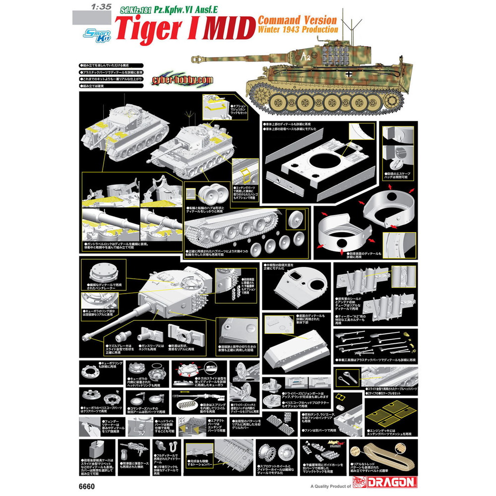 キットは1/35スケールでティーガーIを再現したプラスチックモデル組み立てキットです。ティーガーIは中期生産型の指揮戦車をモデル化しています。