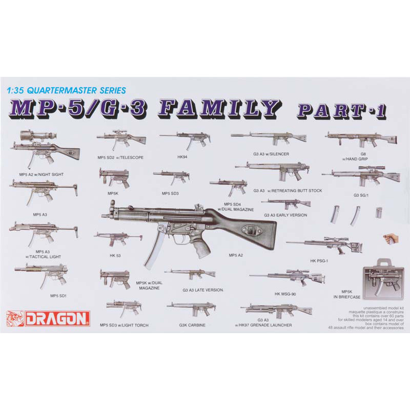 1960年代にドイツのヘッケラー&コッホ社によって開発されたサブマシンガン、MP-5、および、そのベースとなったG-3の各種バリエーションを含めて1/35スケールで再現したプラスチックモデル組み立てキットです。