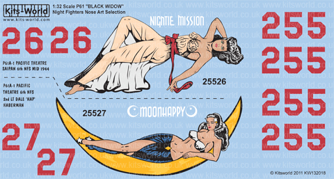 1944年の太平洋戦線での戦闘に参加した第6夜間飛行隊所属の”Nightie Mission”と”Moonhappy”を収録したデカールセットです。