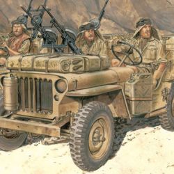 第二次世界大戦中の1941年、イギリス陸軍のデビット・スターリング少佐の提案により創設されたのがスペシャル・エア・サービス(SAS)と呼ばれる特殊部隊です。小グループで敵陣深く侵入し敵飛行場の航空機を破壊したり、偵察や後方攪乱などの任務を目的としていました。特に北アフリカ戦線では砂漠を踏破してドイツアフリカ軍団の補給線や飛行場を攻撃するなど多大な活躍を見せて一躍その名を知らしめました。そんなSAS部隊が使用した車両が連合国各国で採用されていた4輪駆動の1/4トン小型軍用車です。すぐれた機動性や信頼性の高さなどで連絡や輸送はもちろん武器を搭載して戦闘車両としても活躍。終戦までに60万台以上が生産された傑作車両です。SAS部隊ではこの車両に機関銃で武装を施したり補助燃料タンクを多数搭載するなどの改造を施して使用。数台で数ヶ月に及ぶ作戦行動を展開したのです。兵士たちの頼もしい相棒として高い信頼を集めました。