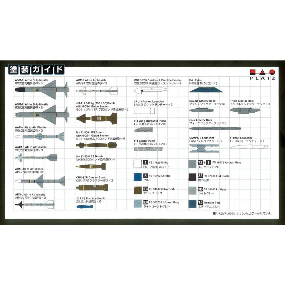 ASM-2/ASM-1/AAM-3/AAM-4/GCS-1 Mk82/GCS-1 JM-117/AIM-7/AIM-9LAIM-9P/MK82/CBLS200/CBU-87BLAMPS-4 ランチャー/F-104J用 ランチャーLAU-3 ロケットランチャー/F-2用翼下パイロンF-1用胴体中央パイロン/F-1用翼下外側パイロン/フォーエジェクターラック/ダブルエジェクターラック/トリプルエジェクターラック