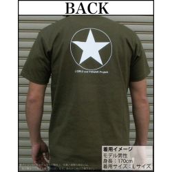 ミリタリーには欠かせない色、オリーブ色地に白文字をプリントしたすっきりとしたデザインで、男女を問わずお勧めできる一枚です。
