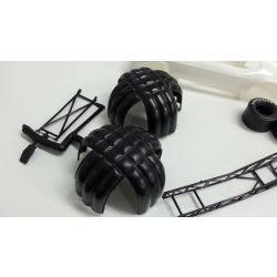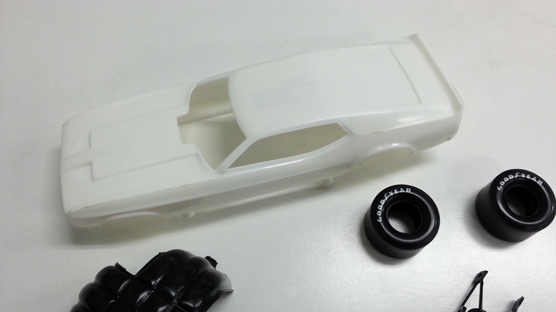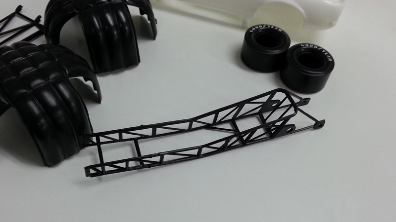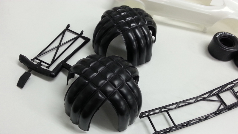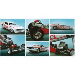 シャシーにかぶせるボディは70年代前半にハイパフォーマンスカーとして人気を集めたフォード・マスタングのマッハ1をシャシーに合わせて全長を伸ばすなどアレンジしてデザインされたスタイルを実感豊かにモデル化。ボディに描かれたストライプやホットロッドマガジンをはじめとするスポンサーマーク、されに、リアルに描かれたリアパネルとフロントグリルも大型スライドマークでセット。ボディは完成後も上げた状態、シャシーにかぶせた状態を楽しんでいただけます。ファニーカーの構造も楽しめるキットです。さらに、ゴール後にテールに開くドラッグシュートのパラシュート部品も用意され、ゴール時のスタイルを再現することも可能です。アメリカンモータースポーツの興奮も味わっていただけるモデルです。