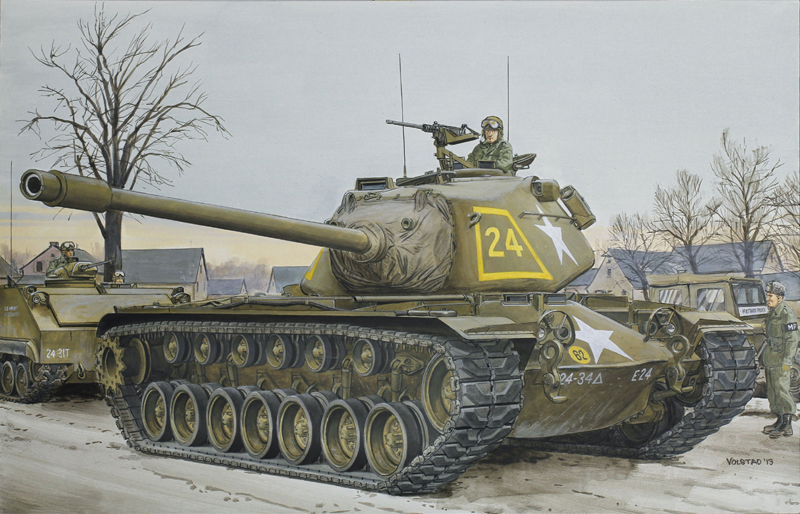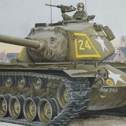 第二次世界大戦後の冷戦時代、1957年からアメリカ陸軍、海兵隊に配備された重戦車がM103です。ソビエトの122mm砲を搭載したIS-3スターリンやT-10戦車に対抗するためアメリカは120mm砲を搭載した重戦車の開発を進めました。M48パットン戦車などと多くの部品を共用しているM103は主砲に60口径120mm戦車砲を装備。分離式の砲弾、装薬により2名の装填手を必要としたため、砲塔が大型化しているのも特徴です。エンジンはM48と同じコンチネンタルAV1790V型12気筒空冷ガソリンエンジンを搭載。1957年から陸軍と海兵隊に配備されました。