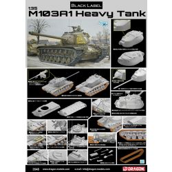モデルはこれまで多くのモデルで培った正確さや高品質なモデル化の技術を生かしたドラゴンモデルの新ブランド「ブラックラベル」の第1弾です。 1959年から生産されたM103の改良型、新型の照準器と弾道コンピューターを搭載したM103A1を1/35スケールで正確に再現しました。ほぼ全てのパーツを新開発。砲塔は不規則で独特なフォルムを正確に再現。砲身を長く突き出した迫力も伝わる仕上がりです。加えて、砲塔、車体上部の鋳造肌も適度な再現で重量感をも感じさせる表現を楽しんでいただけます。また、キャタピラには取り付けが手軽なDSトラックを採用。ロードホイールは傑作キットとして人気のM48パットンのキットのものを使用した組み立てやすさも魅力のキットです。