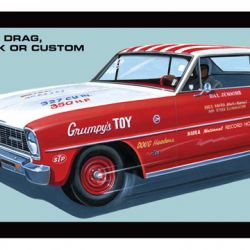 アメリカで人気のモータースポーツのひとつ、ドラッグレースの車両としても様々にチューンされたノヴァが多くのドライバーの手で活躍しています。ビル・ジェンキンスもそんなドライバーの一人です。「気難し屋」といった意味の「Grumpy」というニックネームで人気を集めたビル・ジェンキンスは1955年にドラッグレースを始めました。1966年はメーカーサポートがない中、自分でチューンしたエンジンを搭載したシェビー・ノヴァで活躍したのです。1965年から75年にかけてNHRAのレースで13勝を上げたほか、エンジンビルダーとしても活躍しました。
