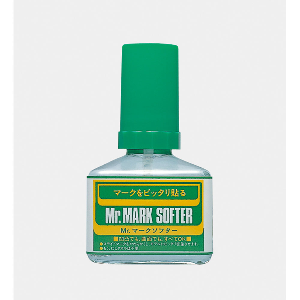 このマークソフターはデカール、スライドマークの軟化剤です。デカール、スライドマークを張る前に貼る場所にあらかじめ少量塗っておくことでベースフィルムをやわらかくして、マークが凹凸でも曲面でも馴染みやすくなります。凹凸が多いモデルのマーキングやパーツ表面が均一な面でないモデルなどにぜひご利用ください。