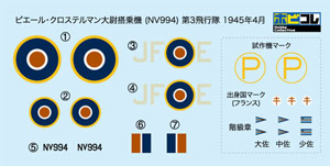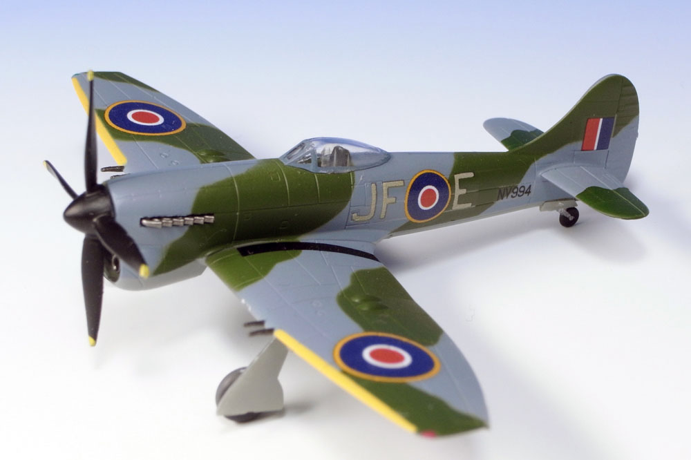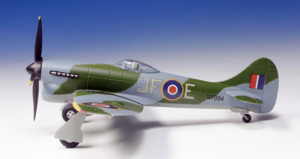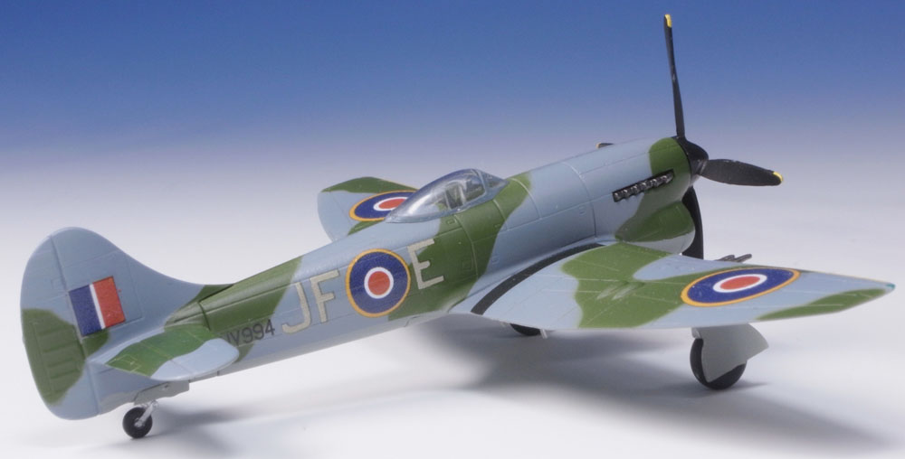 テンペストのエースとして最も有名なピエール・クロステルマン大尉。彼は終戦までに何機かのテンペストに搭乗していますが、このNV994は実戦部隊(第3飛行隊)での彼の搭乗が写真で確認できる1機。多くのテンペストは主翼上面のラウンデル(国籍マーク)がタイプB(赤/青)ですが、このNV994ではタイプC1(赤/白/青/黄)となっているのが特徴です。