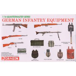 第二次世界大戦でドイツ軍兵士が装備した各種火器と装備品を1/16スケールで再現。ソビエト軍から鹵獲して使用した短機関銃もセット。