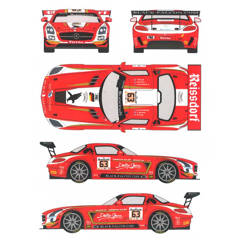 このセットでは2014年にベルギーのスパ・フランコルシャンで行われたブランパンGTシリーズの1戦、トータル24時間レースに出場したブラックファルコン・レーシングチームのメルセデスSLSGT3、カーNo.63のマーキングを収録しています。