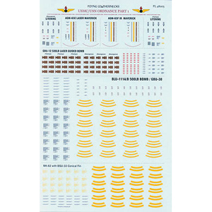 AN/AAQ-28 ライトニングIIポッド、AMG-65E/Fマーベリック、MK-82、BLU-111A/B、GBU-38、GBU-12の500ポンド爆弾ファミリー用デカールを収録。デカール印刷はイタリア カルトグラフ。