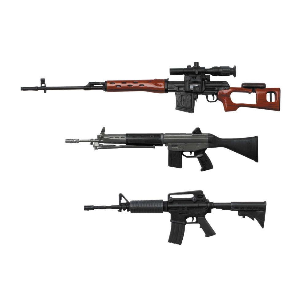 モデルは1/12スケールで日本の89式小銃、アメリカのM4A1ライフル、そして、ソビエトのSVD&PSO-1のスコープ付き 狙撃銃を再現したプラスチックモデル組み立てキットです。