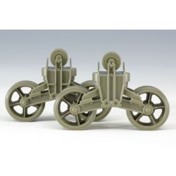サスペンション上部のリターンローラーが中央にある極初期型をモデル化。実車とほぼ同様の構造でサスペンションの可動を実現。ボギー本体の前面はM3の後期型の一部やM7プリースト等で見られる補強リブの入ったタイプも付属。車体前後のボギーの取り付けられている釣下げフックもパーツ化。ロードホイルはM3及びM4初期型では最も一般的な穴開きスポーク型を用意。スプロケットホイルは3種類の中から選択可能。M3中戦車及び初期のM4シャーマンはもちろん、共通の足回りを使用した多くの系列車輌に使用できます。