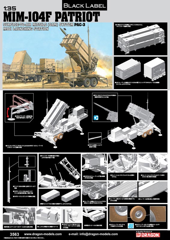 第二次大戦後の冷戦時代を中心にユニークなアイテム選びで注目を集めるドラゴンのブラックラベルシリーズからの登場です。世界各国で配備、運用されているパトリオットミサイルシステムを1/35スケールで再現。PAC-3SAMキャニスター、それをM860セミトレーラーに搭載したM901発射機をモデル化しています。