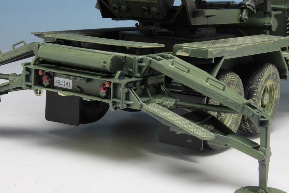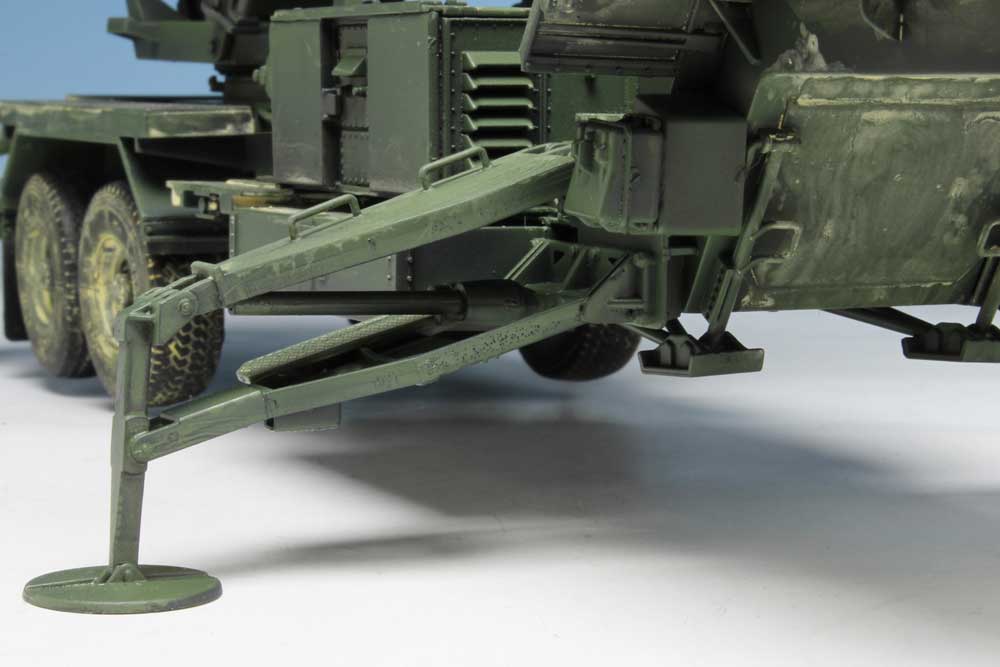 4本のスタビライザーアームも開いた状態、上げた状態を選択可能。情景製作の幅も広がります。もちろん、セミトレーラーに装備されている電子ユニットやディーゼルジェネレーターセット、アンテナなどの装備類もしっかりとモデル化しています。トレーラーのタイヤは質感あふれるDS樹脂製。トレッドパターンも繊細に表現されています。