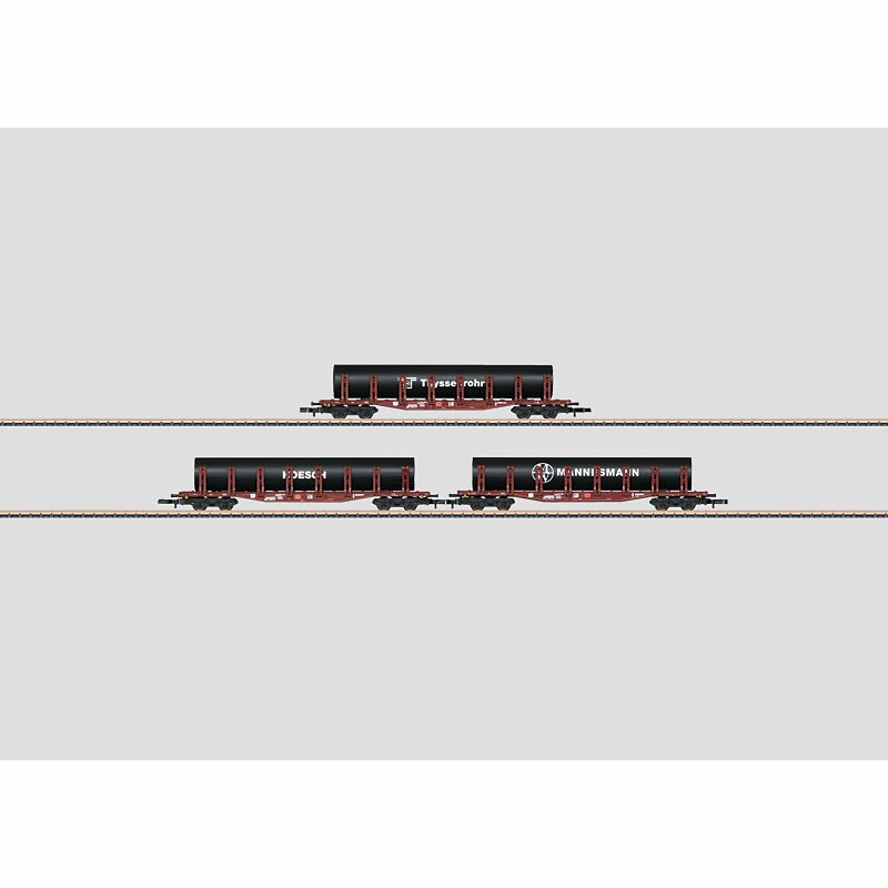 The cars have detailed, fixed stakes. They also have different car numbers. Each car is loaded with a large, lettered pipe. Total length over the buffers approximately 285 mm / 11-1/4.