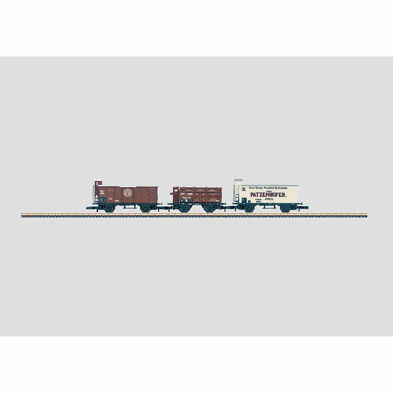 The set has 1 beer car with a brakeman's cab, lettered for Patzenhofer, 1 gondola with hinged roof hatches and a brakeman's cab, and 1 boxcar with a brakeman's cab. All of the cars have dark nickel plated wheels. Total length over the buffers 119 mm / 4-11/16.