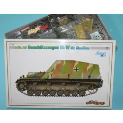 III/IV号車台はスライド金型で再現された車体下部やリーフスプリングを使ったサスペンションなど、正確にモデル化。車体下面の点検ハッチなどもしっかりと表現しています。履帯には立体感ある仕上がりの組み立て式マジックトラックを採用。また、オープントップの戦闘室装甲板はエッジ部分をインジェクション成型の限界に近い薄さに成型し、モデラーの削り込み作業を必要とせずにシャープな仕上がりを約束。主砲をはずして開いた部分を塞ぐエッチングパーツや側面装甲板にある空気取入口の保護カバーもエッチングパーツでセット。もちろん室内には装薬、弾体、装薬ケース、弾体ケースをモデル化しているのは言うまでもありません。また、オープントップの戦闘室を覆うキャンバスパーツもリアルな質感のDS素材パーツでセットされています。デカールは高品質で定評あるイタリアのカルトグラフ社製です。