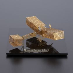 モデルは1906年にフランスで2回にわたって公開飛行実験を実施、最長220mを飛行してヨーロッパで最初に飛行に成功した飛行機となった、サントスデュモン14bisを1/160スケールで再現しています。仕上がりのサイズはウイングスパンが65mmの大きさ。前翼を持つエンテ型デザインを採用、箱型の独特な翼デザインなどをそのフレームやリブなど、メカニカルに再現したスケルトンタイプの仕上がり。その構造が理解できる興味深いモデルです。真鍮のエッチングパーツで機体部品のほか、操縦席に収まるパイロットフィギュアも用意。そして、アクリルのディスプレイベースもセットされています。
