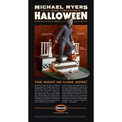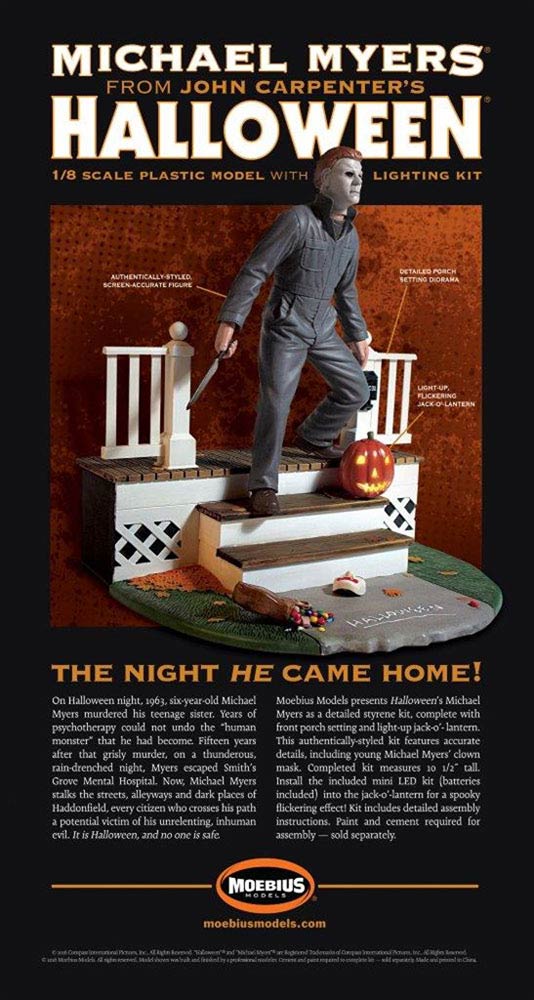 モデルはハロウィンシリーズの主人公、殺人鬼のブギーマンを1/8スケールで再現。以前、旧ポーラライツから発売されていたキットに、新たに電飾ユニットを組み込んだ豪華な仕様です。さらにパッケージやインストも一新、充実した内容のキットです。ブギーマンのほか、事件の現場となった家の玄関ポーチもセットされた情景仕立てのキットです。