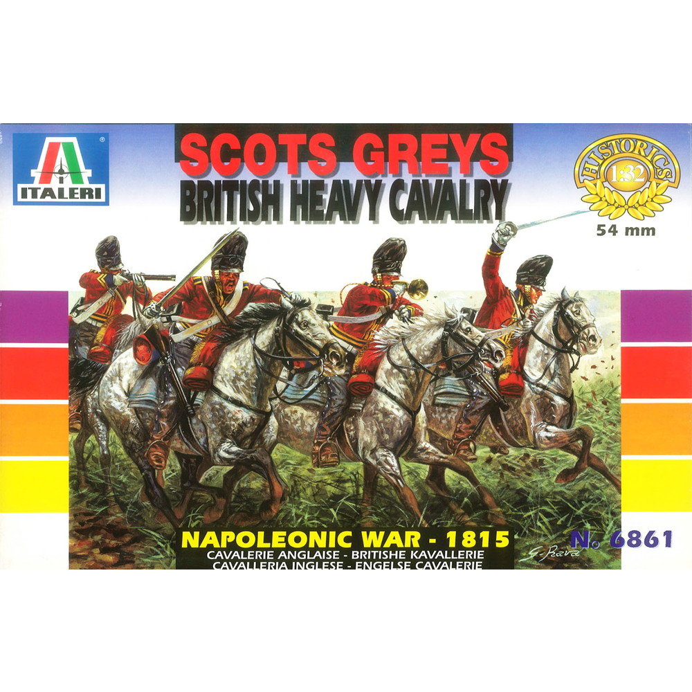 ●ナポレオン戦争の終盤、1815年のワーテルローの戦いにおいて活躍したアクスブリッジ伯爵指揮下の ポンソンビー連合騎兵旅団の3つの戦隊のうち、スコットグレイ戦隊の騎兵を1/32スケールで再現するプラモデルフィギュア組み立てキット