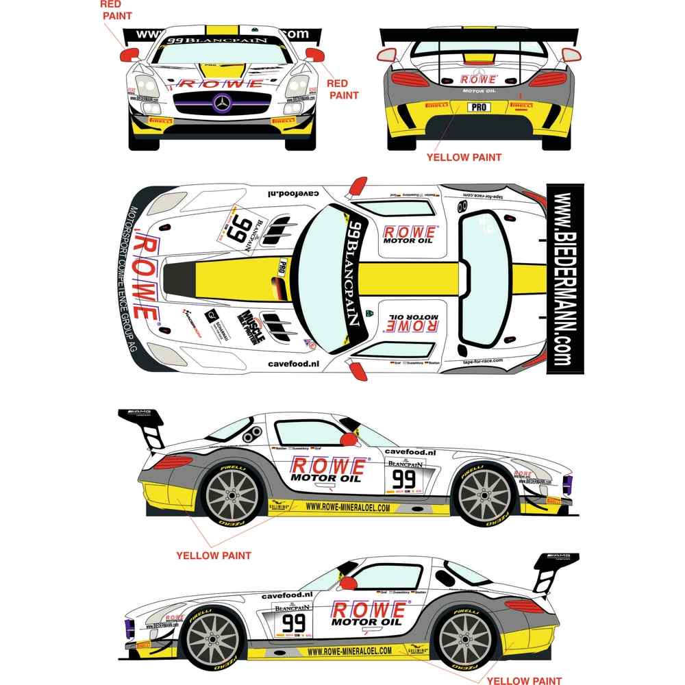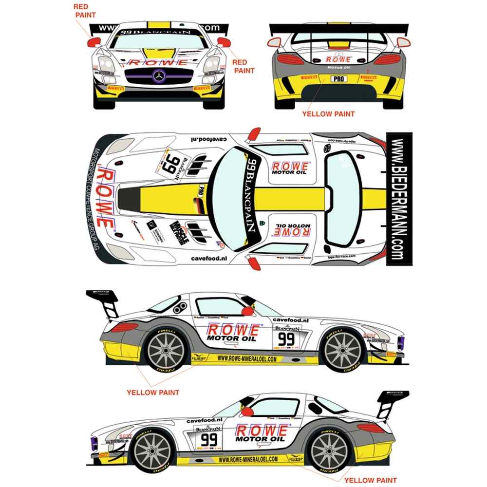 このセットでは2015年にイギリスのシルバーストンで行われたブランパンGT耐久シリーズに出場したROWEレーシングチームのメルセデスSLSGT3、カーNo.99のマーキングを収録しています。