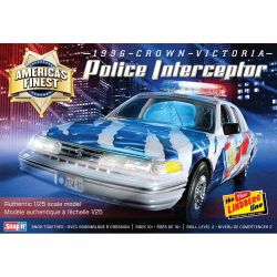 モデルは1/25スケールでフォード・ビクトリアのパトカー仕様を再現しています。1992年に登場した初代ビクトリアの後期型で1996年モデルを再現。車体全長は20cmにも達するフルサイズカーならではの存在感あふれるサイズです。この車両はアメリカズ・フィネスト、最優秀賞に輝いたパトカーをモデル化しています。ボディはアメリカ国旗、星条旗をアレンジしたデザインで飾られている派手なマーキングを再現。カラフルなマーキングは塗装済みです。加えて、キットは組み立てに接着剤を使わないはめ込み式を採用し、パーツ点数も抑えられていますから手軽に取り組んでいただけることでしょう。また、インテリアやシャシーもパーツ数を抑えながら立体感ある雰囲気たっぷりな仕上がり。ヘッドライトやルーフランプは透明パーツ、さらに、メッキパーツなどもセットされ、仕上がりの実感を高めます。