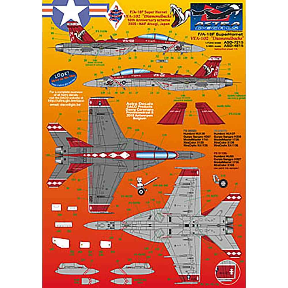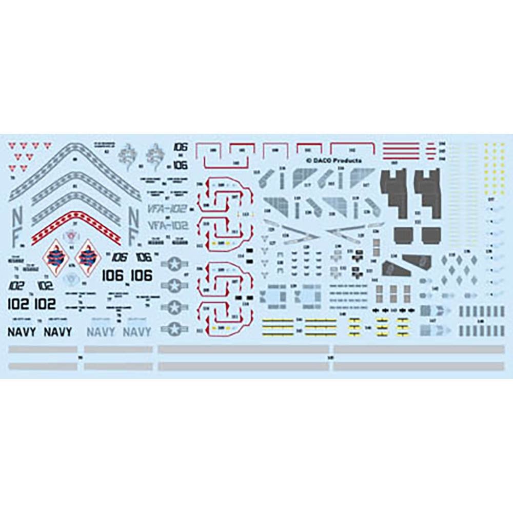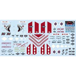 このセットではアメリカ海軍が運用するF/A-18のマーキングを収録するデカールセットです。中でも日本の厚木基地に展開するVFA-102ダイヤモンドバックスの機体のマーキングを収録。尾翼に描かれるガラガラヘビのイラストなどをしっかりとセット。このセットでは2005年に部隊創設50周年を祈念して102号機に施された特別マーキングのほか、2007年100号機のCAG機と102号機のCO機のスキーム、そして、106号機の2007年標準スキームの4種類のスキームを収録しています。1/72F/A-18をVFA102ダイヤモンドバックス仕様で仕上げていただけるデカールセットです。