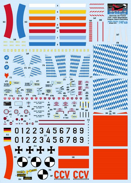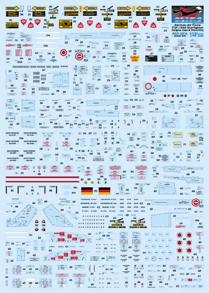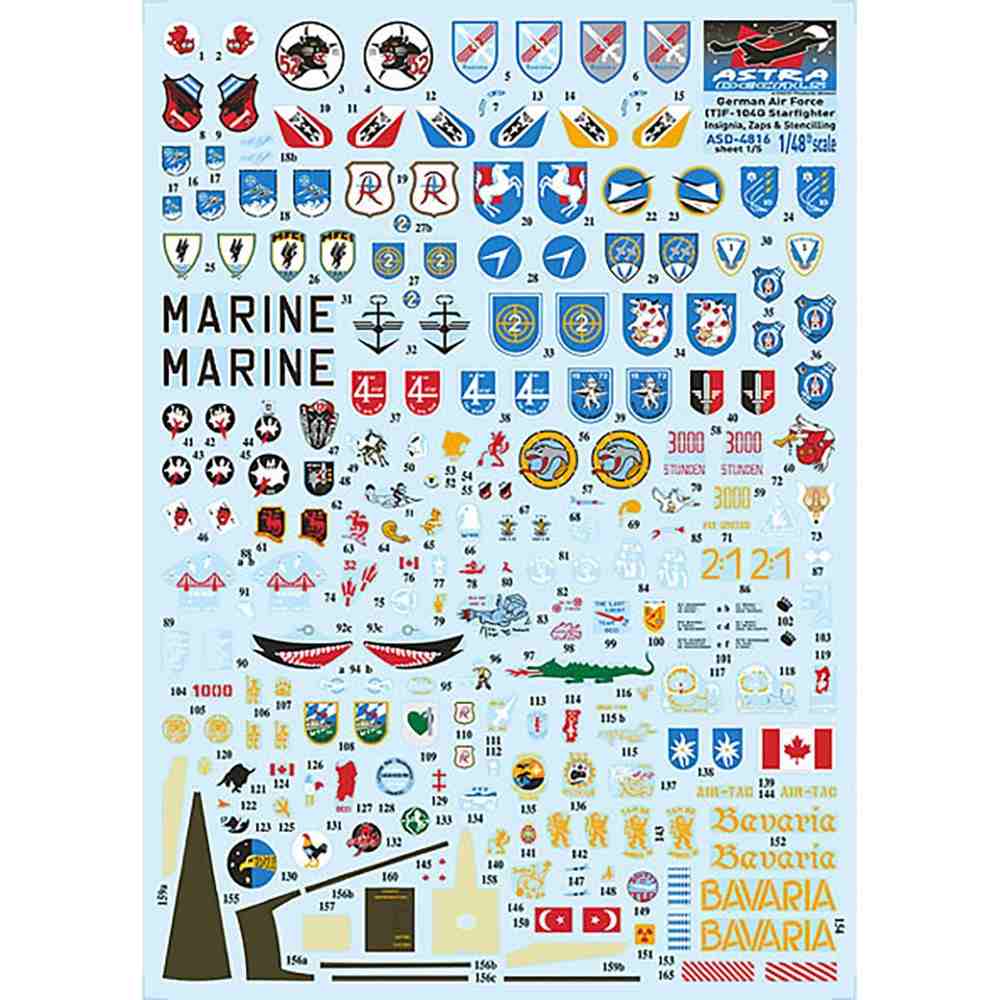 このセットではドイツ軍が配備運用するロッキードF-104Gスターファイターのマーキングを収録しています。1400点以上のマークが収められ、スペシャルマーキングを含めてドイツ軍のスターファイターのほとんどの塗装に対応。しっかりと取材、研究された中か作られた各デカールはもっとも完璧といえるデカールの一つでしょう。