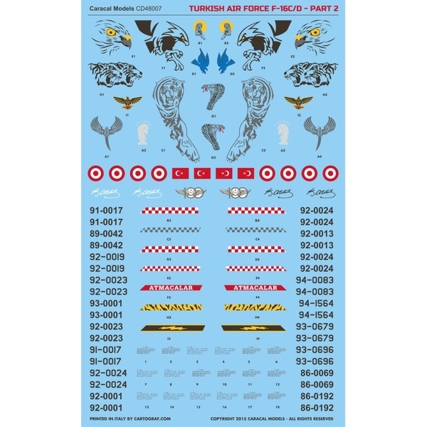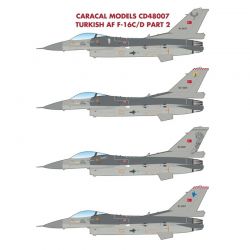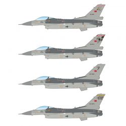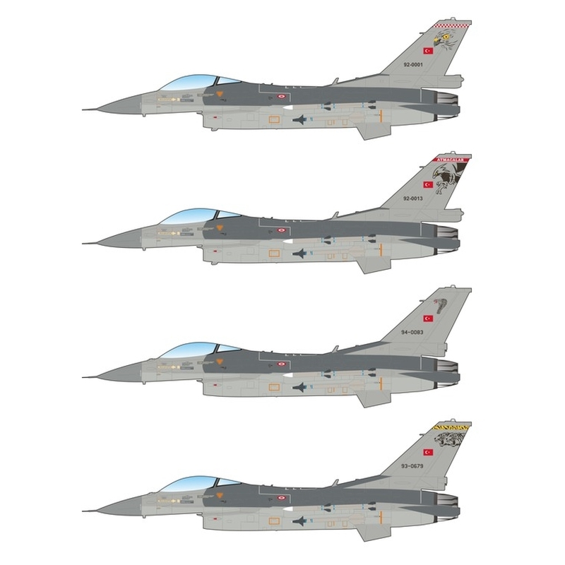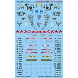このセットは1987年からF-16を導入して運営しているトルコ空軍が運用するF-16C/Dのマーキングを収録しています。パート2ではBalikesir空軍基地とDiyarbakir空軍基地をベースにする飛行体のマーキングを収録。 加えて、第143飛行隊の最新尾翼マーキングもセットされています。マーキングは下記をセット。ステンシルマーキングも収録。