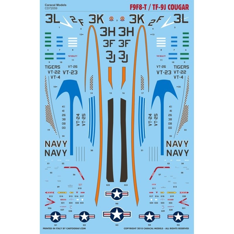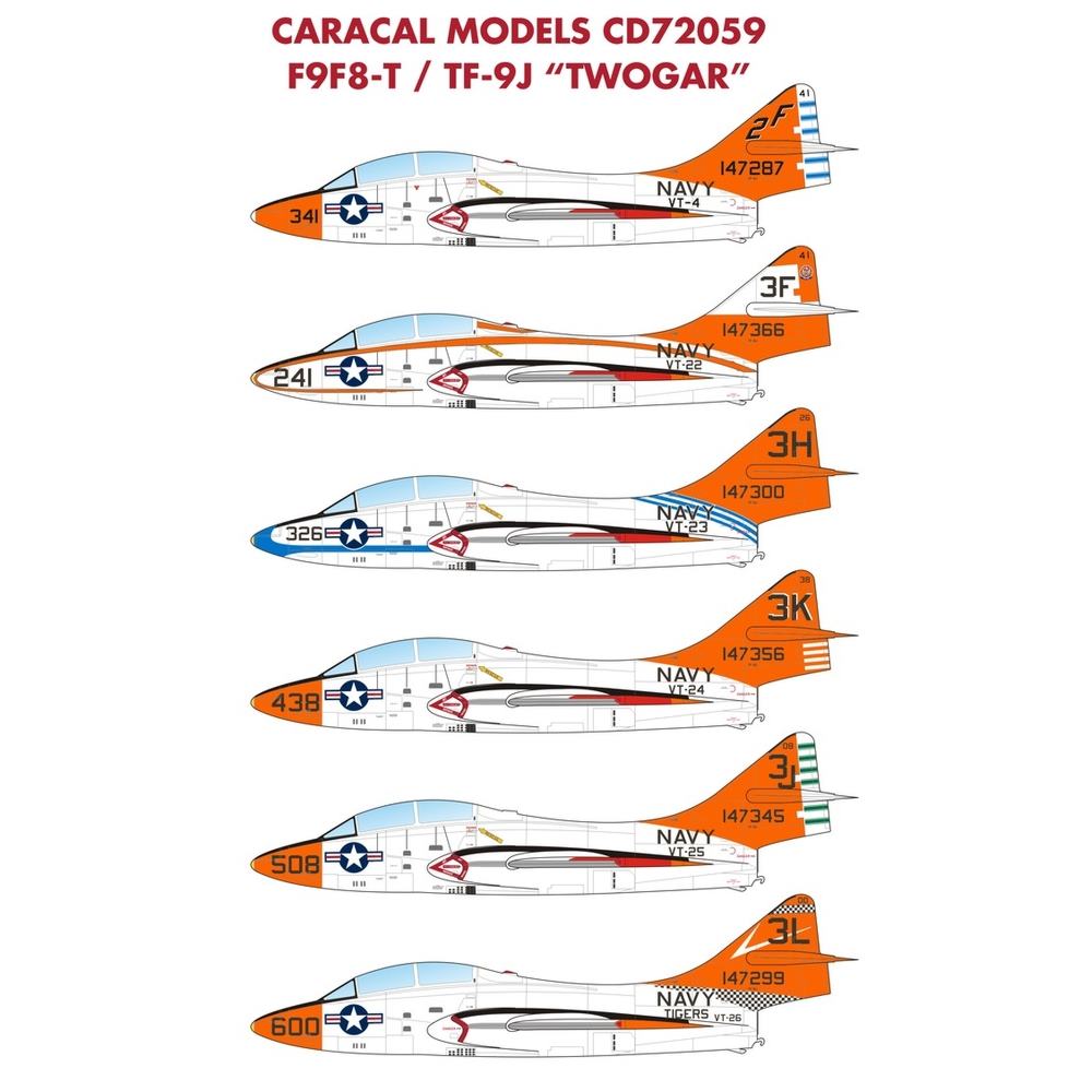 このセットはアメリカ海軍が運用したF9Fの複座練習機型、F9F-8T/TF-9Jのマーキングを収録しています。アメリカ海軍の教育部隊の中から6機のマーキングをセレクト。ステンシル類は1機分が入っています。