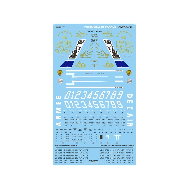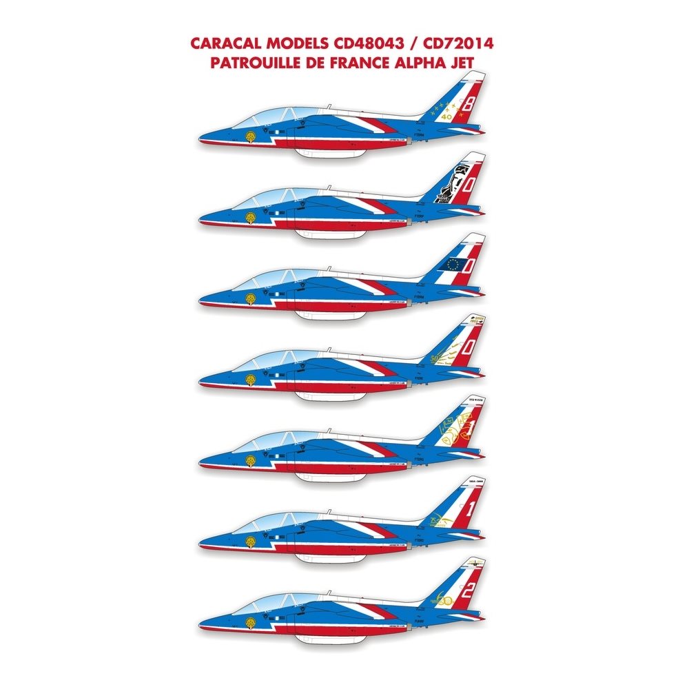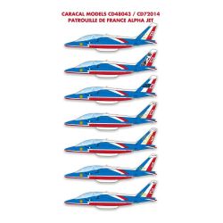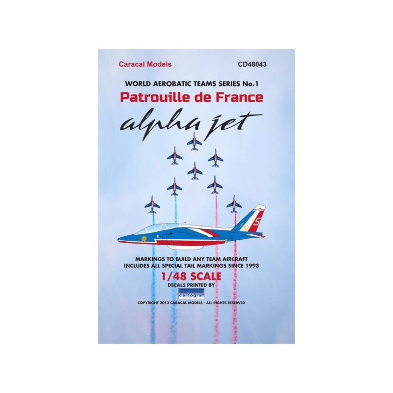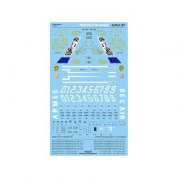 このセットはフランスのエアロバティックチーム、パトルイユ・ド・フランスが運用するアルファジェットのマーキングを収録しています。2013年に活動60周年を迎えたパトルイユ・ド・フランスの2013年シーズンの機体のマーキングのいずれかを選べるほか、1993年からチームが描いていた特別なテールマーキングもセットされています。ステンシル類は1機分を用意。