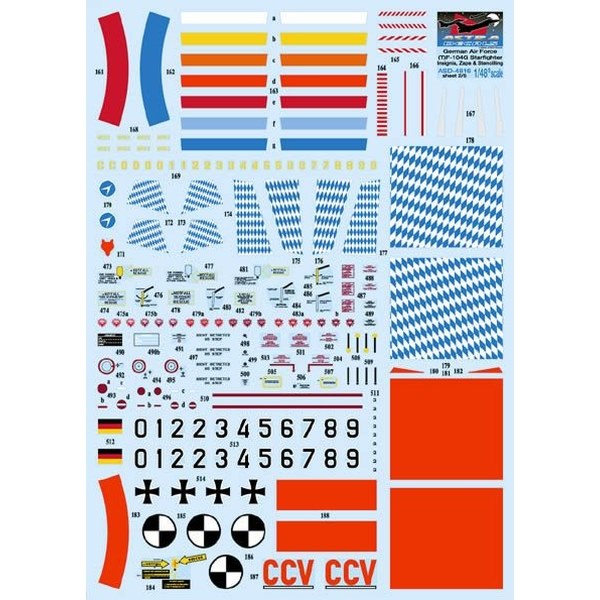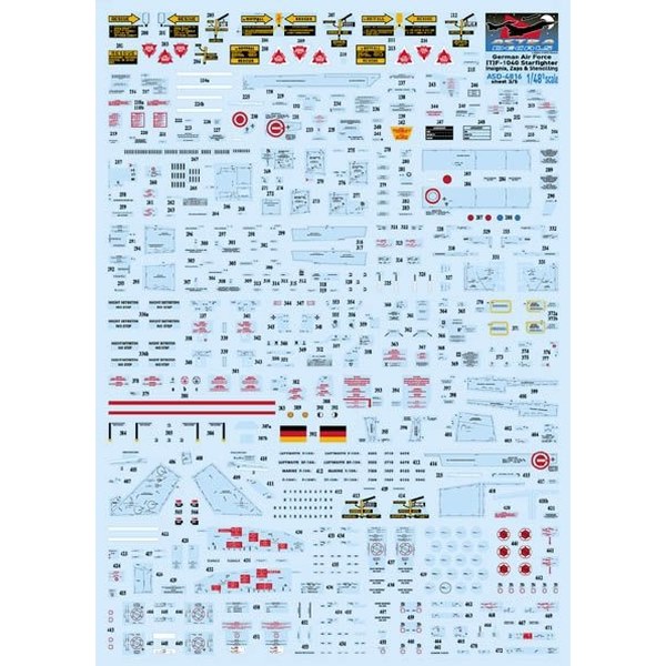 このセットではドイツ軍が配備運用するロッキードF-104Gスターファイターのマーキングを収録しています。1400点以上のマークが収められ、スペシャルマーキングを含めてドイツ軍のスターファイターのほとんどの塗装に対応。しっかりと取材、研究された中か作られた各デカールはもっとも完璧といえるデカールの一つでしょう。