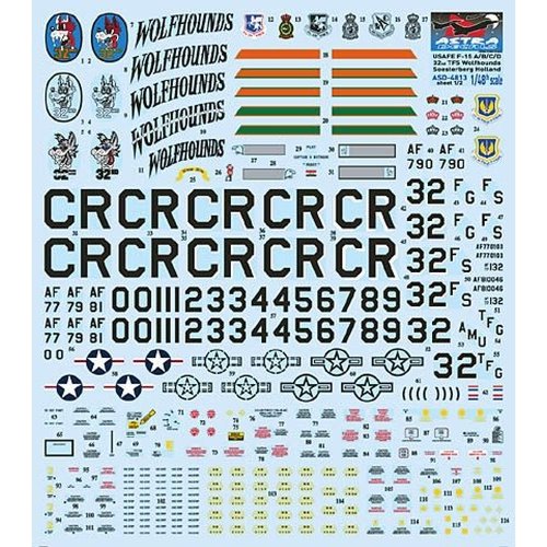 このセットでは戦後オランダのウルフハウンズソーステルベルフ基地に展開していたアメリカ空軍が当時配備運用した戦闘機、F-15のマーキングを収録しています。2枚組のデカールシートで当時の3種類のカモフラージュ塗装に対応したマーキングが収められています。海外の部隊で唯一オランダ王室の王冠の使用を認められたエンブレムも見逃せません。