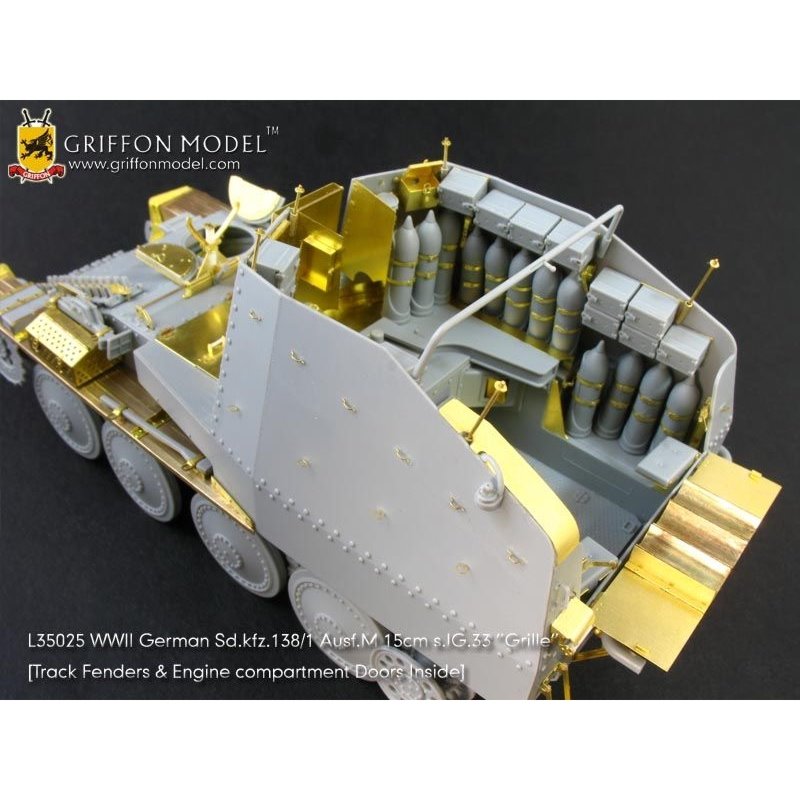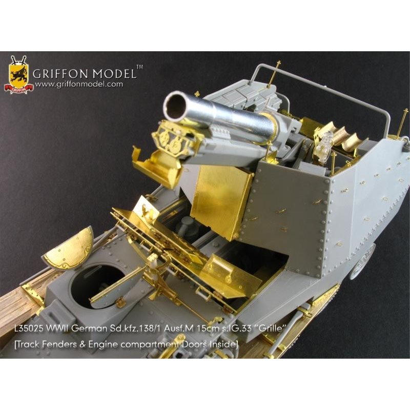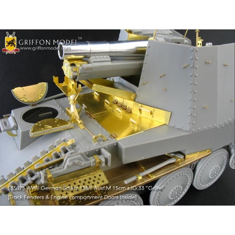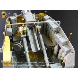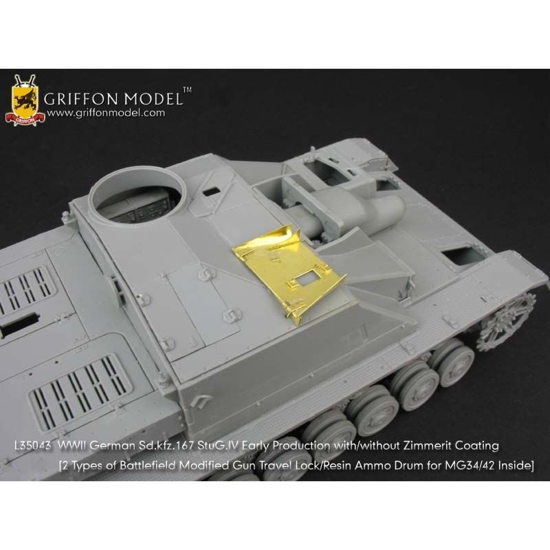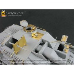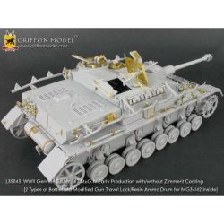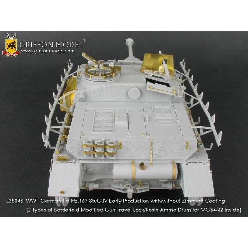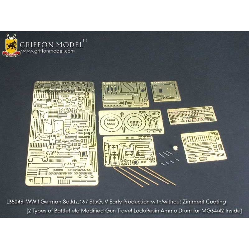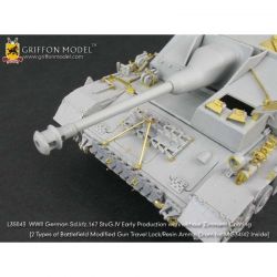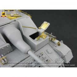 第二次大戦でドイツ軍主力戦車IV号のバリエーションとして開発された突撃砲の低くシャープな形状をさらにディテールアップ。セットには戦闘室上部の装填手MG42用ガンシールドをはじめ、初期型のコマンダーズキューポラのディテールパーツ、さらに、前線で改造されたガントラベルロック2タイプなどにいたるまで、外観をディテールアップするエッチングパーツを収録。予備履帯の取り付けリンクや予備転輪の搭載ラックなども入っています。セットには詳しい説明書もついて、確実なディテールアップをお楽しみいただけます。プラスチックパーツとは違ったシャープなディテールがリアリティあふれる1ランク上の完成品を仕上げていただけるセットです。ベテランモデラーにはぜひ、利用していただきたいセットです。