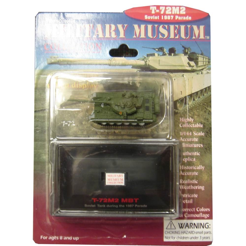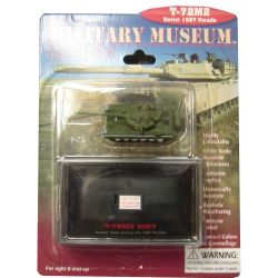 モデルは1970年代から90年代にかけてソビエトの主力戦車として活躍した、T-72の1987年の軍事パレードに登場した仕様を1/144スケールで再現した組み立て完成済みモデルです。T-72の基本形状はしっかりとモデル化。車体はグリーンの基本色で塗装された姿を再現しています。もちろん軍事パレードに登場した際のサイド装甲板やフロントフェンダー、砲塔に描かれたホワイトのラインや転輪の内側をホワイトで塗り分けて化粧した姿を再現。華やかなパレードの雰囲気が見逃せません。全長は約65mm。低い姿勢、小型の砲塔、125mm滑空砲の長い砲身など、その特徴ある車体形状はもちろん、大径のロードホイールを持った車体下部もモデル化。車体後部にはソビエト戦車の特徴である燃料タンクを再現しているほか、あるいは砲塔上のスモークディスチャージャーなども表現。車体上部や砲塔のハッチ類などのディテールも雰囲気を高めています。1/144のスモールスケールながらリアリティを感じさせる仕上がりです。さらに、このセットにはモデルを収めるディスプレイケースもセットされています。コレクションするのも便利なモデルです。