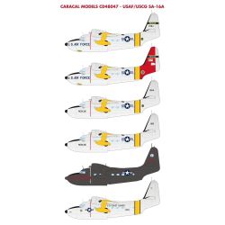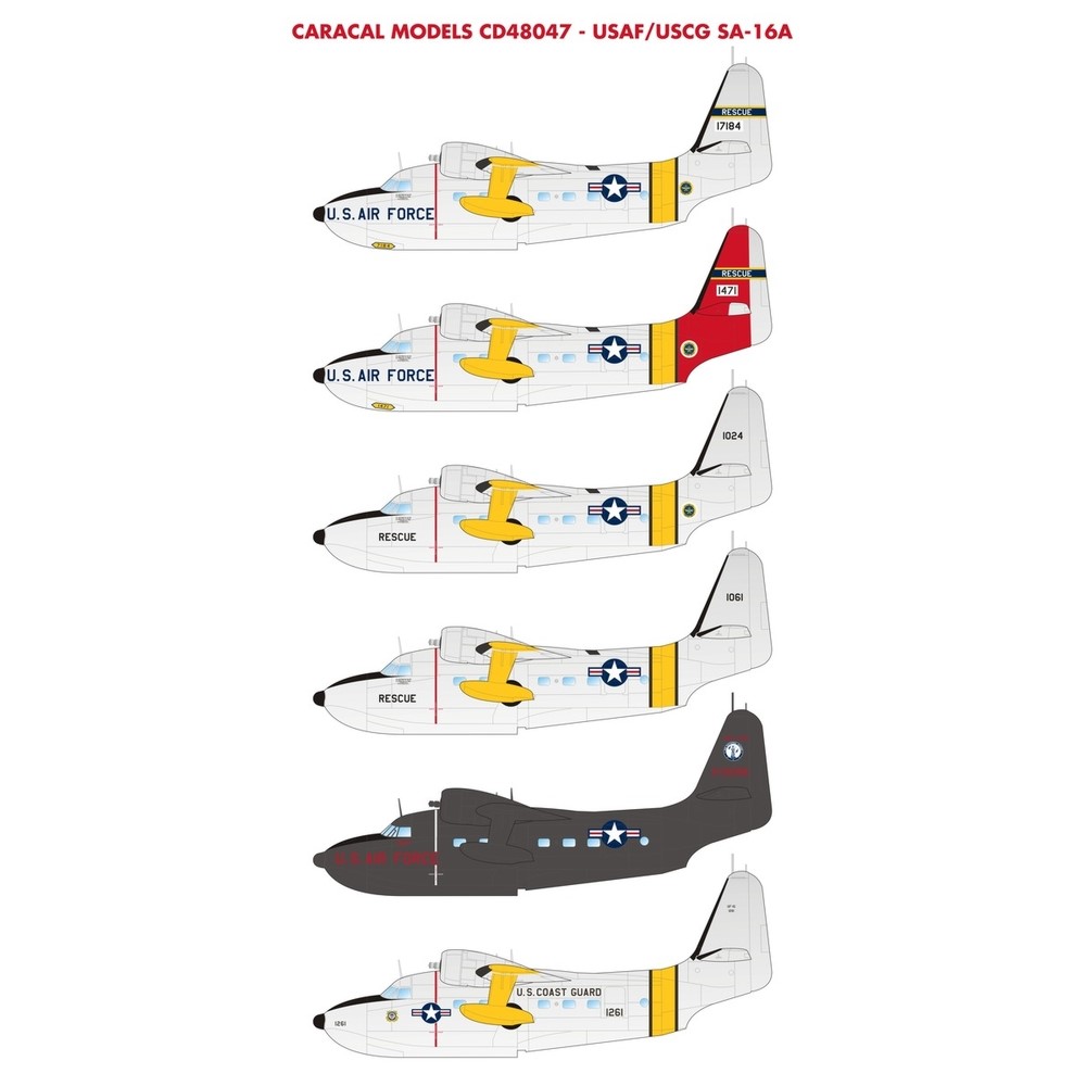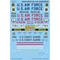 グラマンによって開発され、1949年から運用が開始されたアメリカの水陸両用飛行艇でアメリカ空軍によって使用されたのがSA-16A(HU-16A)アルバトロスです。このセットでは1950年代から60年代にかけて運用されたアメリカ空軍配備機と沿岸警備隊配備機から6機のマーキングを取り上げて収録しています。各機体固有のマーキングから国籍マークなどを3枚のシートで再現。ウイング・ウォークウエイもデカールで用意しています。