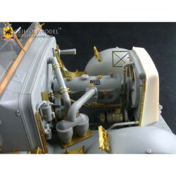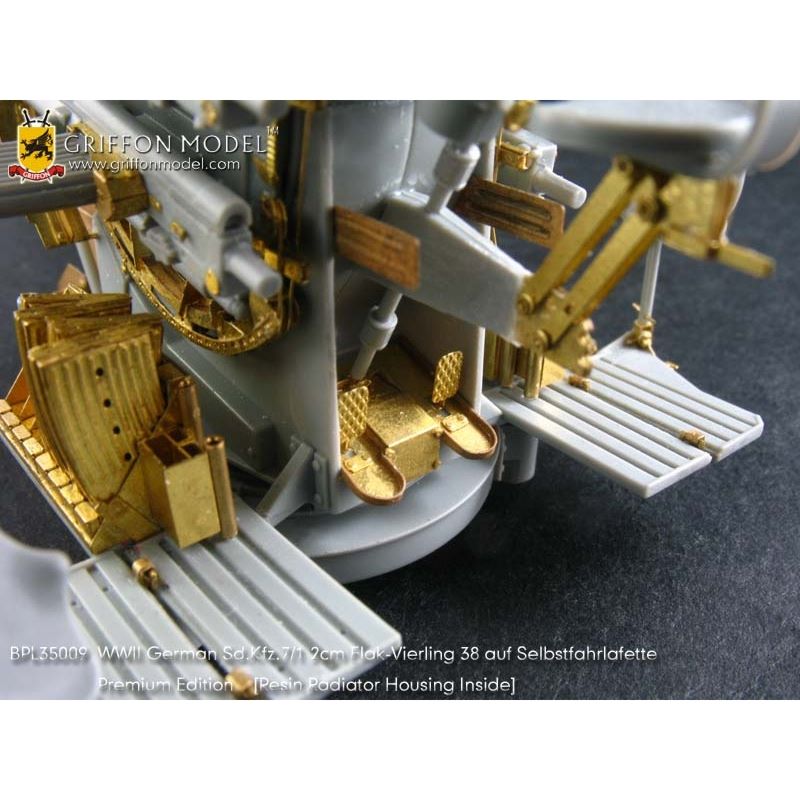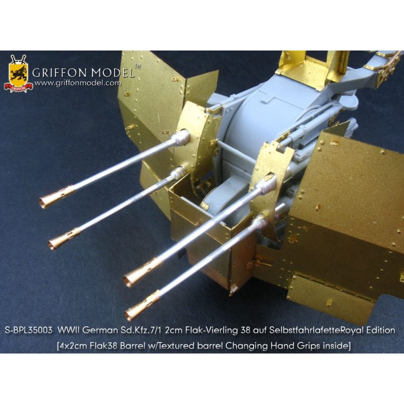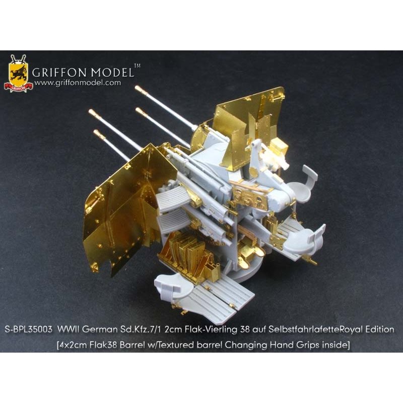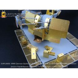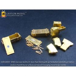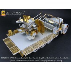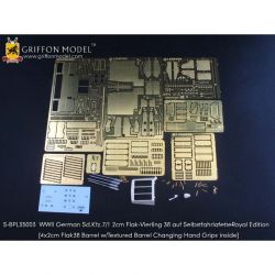 第二次大戦でドイツ軍が開発した8トンハーフトラックに2cm4連装対空機関砲Flak38を搭載した対空自走砲を再現したサイバーホビーのキットをさらにディテールアップ。セットには8トンハーフトラックの荷台に搭載された迫力あるメカニカルな2cm4連装対空機関砲の砲身を再現した金属製パーツや各部の繊細な仕上げを演出するエッチングパーツ、さらに、計器板用のデカールなどがセットされています。詳しい説明書もついて、キットのパーツを置き換えたり、追加することでリアリティあふれる1ランク上の完成品を仕上げていただけるセットです。