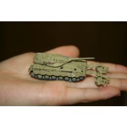 他国の戦車には見られないフロントエンジンレイアウトのメルカバならではのスタイルに地雷処理ローラーがついていっそう個性的な仕上がり。もちろん、車両本体のスタイルに105mm砲を装備するやはり独特な形状の砲塔もしっかりと再現されています。車体、砲塔など、各ハッチ類やディテールなどをリアルに表現。車体はデザートイエローの基本色で塗装された姿を再現。1/144のスモールスケールながらリアリティを感じさせる仕上がりです。
