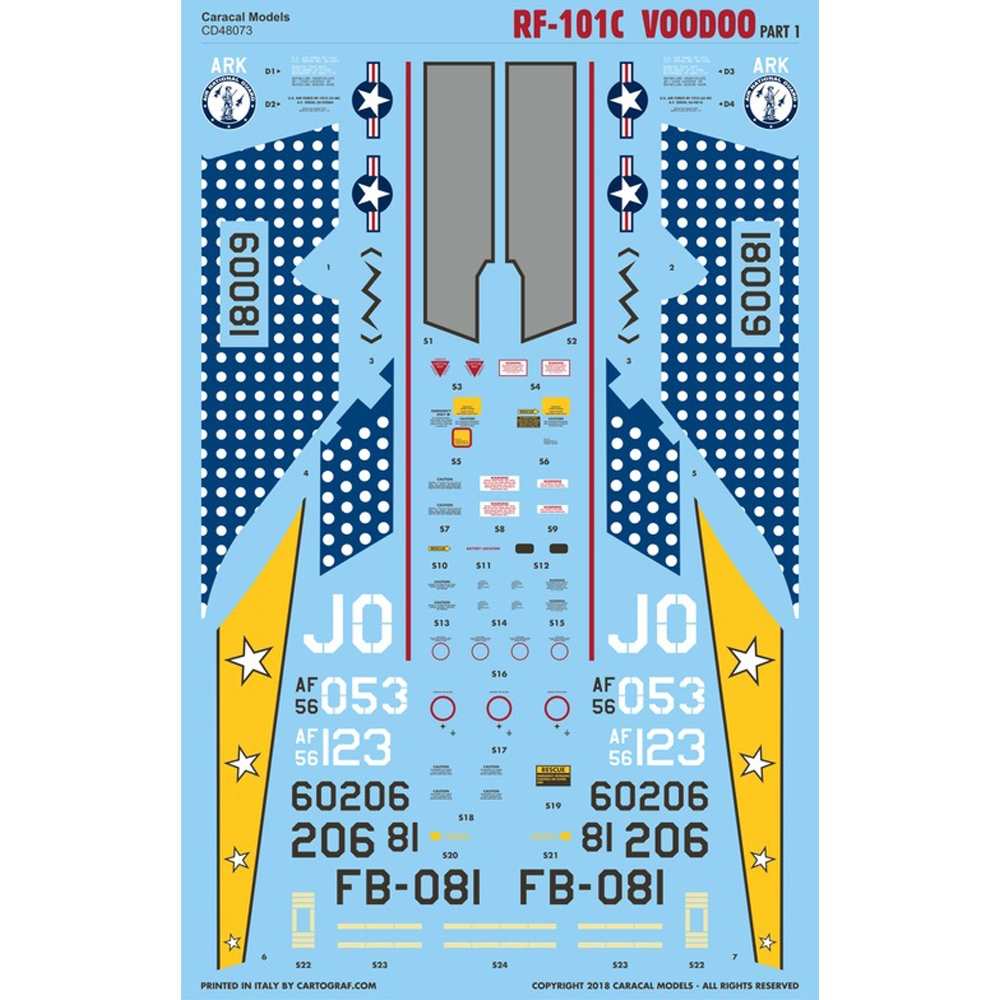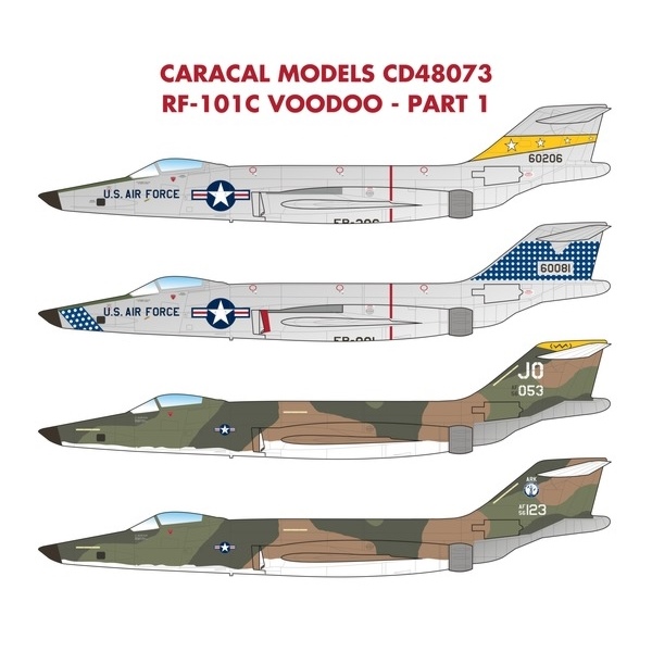このセットは1960年代、ベトナム戦争にも投入されて活躍したF-101ヴードゥーの偵察機型、RF-101Cのマーキングを収録しています。カラフルなマーキングの時代とその後の迷彩塗装を施した時代のマーキングの中から4つのマーキングをセレクト。ステンシルは1機分が用意されています。マーキングは下記の4種類を収録しています。主要なマーキングはカルトグラフ社製、国籍マークはマイクロスケール社製のスクリーン印刷です。