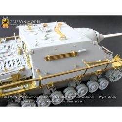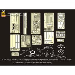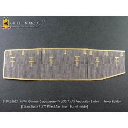 第二次大戦でドイツ軍が開発したIV号戦車のバリエーションタイプ、アルケット社が作った駆逐戦車ツヴァイシェンレーズンクを再現したサイバーホビーのキットをさらにディテールアップ。セットにはディテールアップ用のエッチングパーツと金属製の砲身パーツもセットした充実仕様です。セットのエッチングパーツには車体の左右フェンダーパーツをはじめ、車体側面に装備されるシュルツェンの取り付け用ブラケットなどの外装パーツを収録。シュルツェンの取り付けブラケットのパーツはノーマルタイプの履帯を装着する場合と、幅広い東部戦線&冬季用履帯を装着する場合用の2種類が選択可能です。さらに、主砲のガントラベルロックパーツなどのエッチングパーツを収録。また、主砲砲身のクリーニングロッド収納パイプや車載工具の止め具などにいたるまで、細かなパーツが用意されています。セットには詳しい説明書もついて、確実なディテールアップをお楽しみいただけます。プラスチックパーツとは違ったシャープなディテールがリアリティあふれる1ランク上の完成品を仕上げていただけるセットです。ベテランモデラーにはぜひ、利用していただきたいセットです。