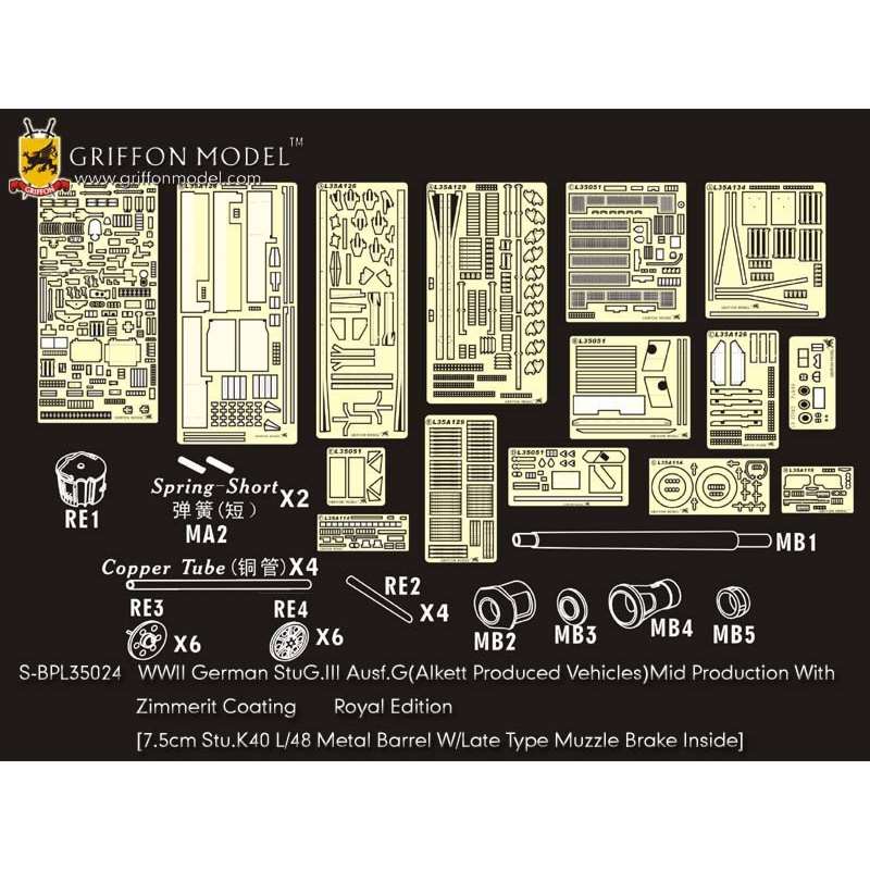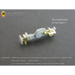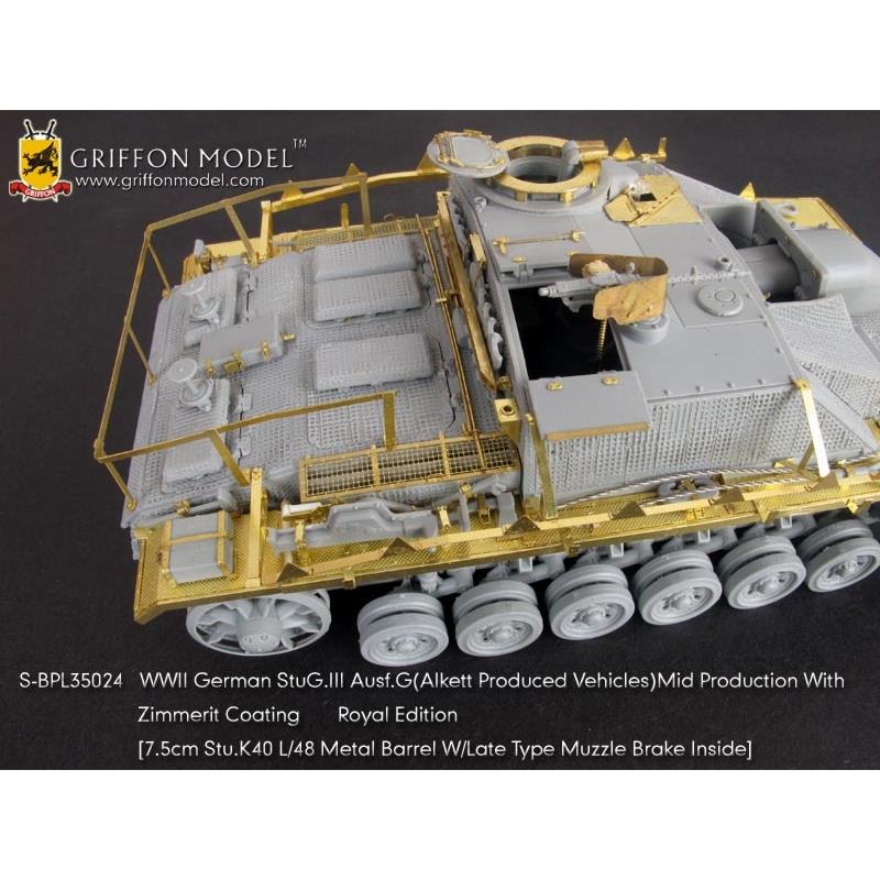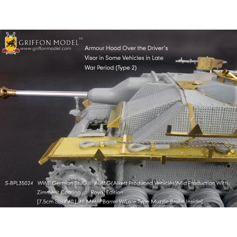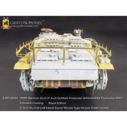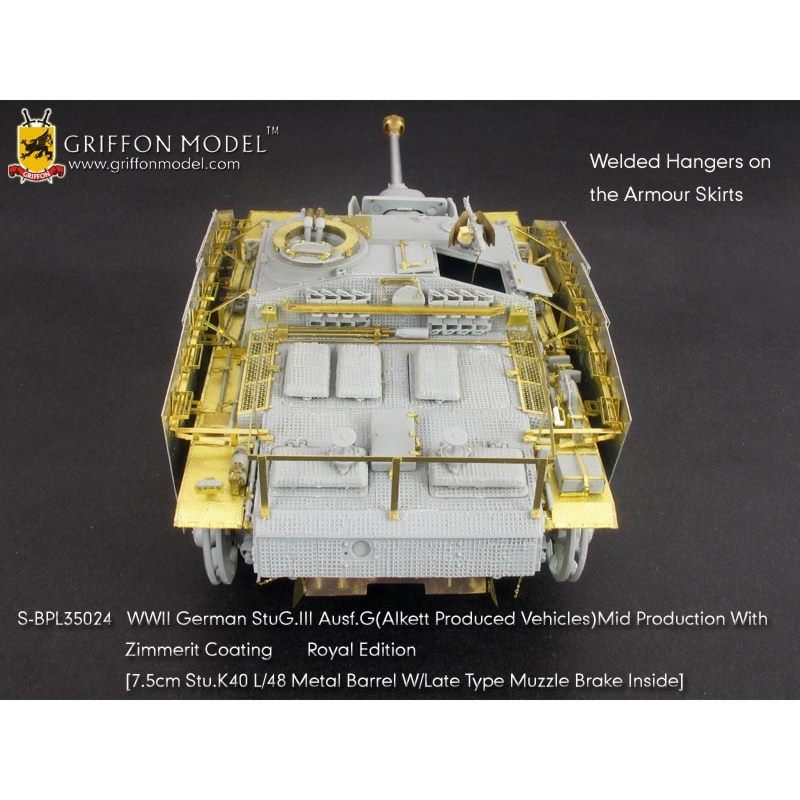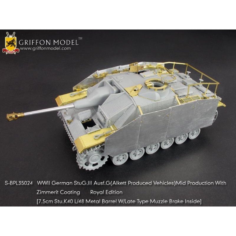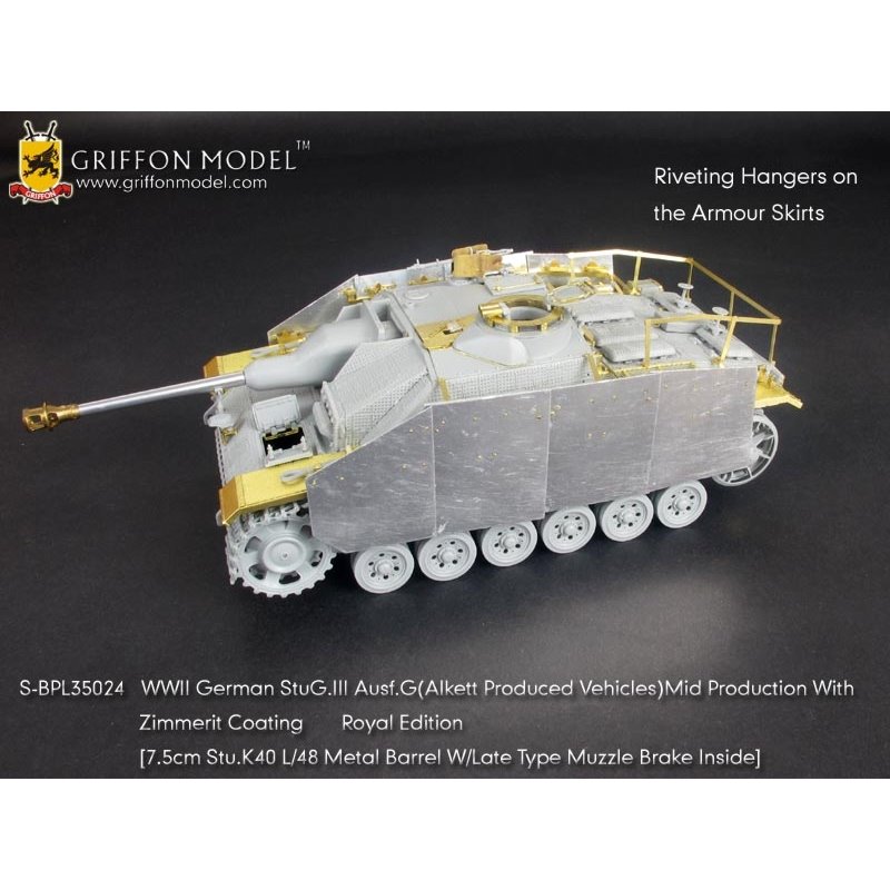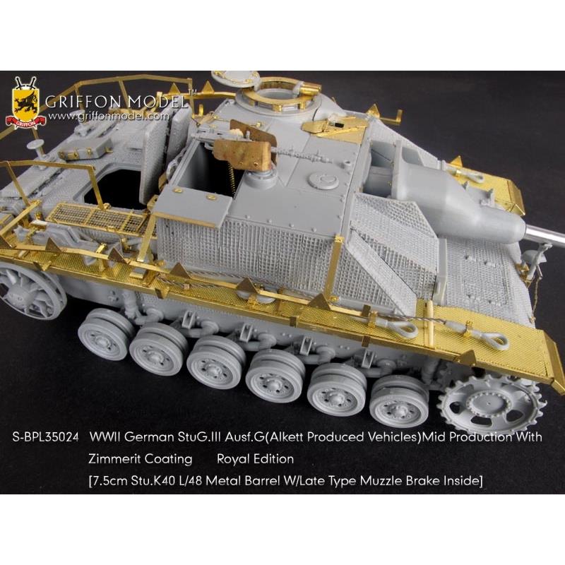 第二次大戦でドイツ軍が開発したIII号突撃砲G型後期生産型を再現したドラゴンのキットをシャープに仕上げます。セットは外装パーツのほか、ハッチ類のインテリアパーツ、さらに、金属製主砲砲身やマズルブレーキパーツなどまで各種パーツが収録された内容充実のセットです。車体は滑り止めの表面のパターンなども表現され、リアルな仕上がりのフェンダーパーツをはじめサイドアーマースカートのマウントブラケットなど、細部までモデル化。大戦後期のいくつかの車両に見られたドライバーズバイザーのオーバー装甲フードも見逃せません。また、エンジンデッキの冷却風取り入れ口のメッシュや荷物搭載ラック・グラブレールパーツなども用意。さらに、アルケット社の6リブ・6穴タイプリターンローラーもレジンパーツでセットされています。くわえて、主砲の金属砲身や金属製のマズルブレーキパーツも仕上がりをシャープに見せます。セットには詳しい説明書もついて、確実なディテールアップをお楽しみいただけます。プラスチックパーツとは違ったシャープなディテールがリアリティあふれる1ランク上の完成品を仕上げていただけるセットです。ベテランモデラーにはぜひ、利用していただきたいセットです。