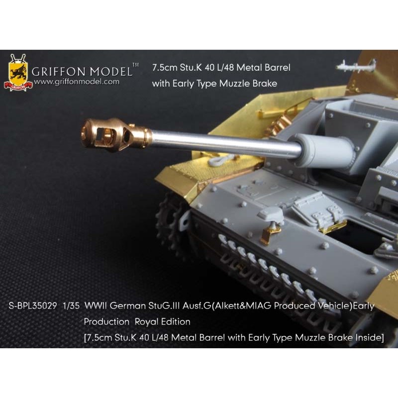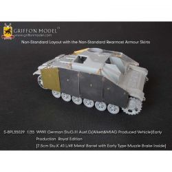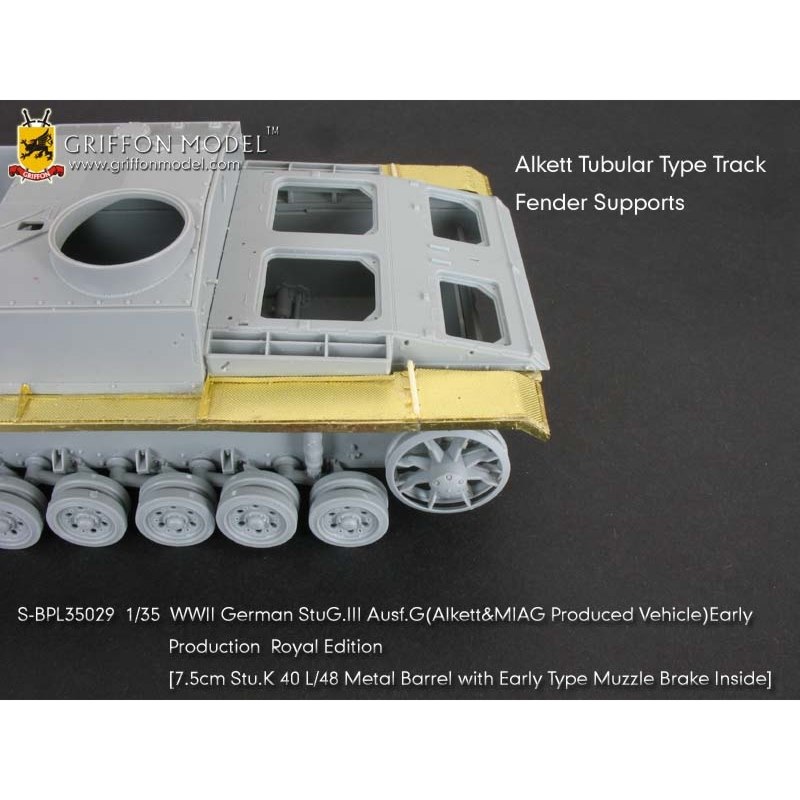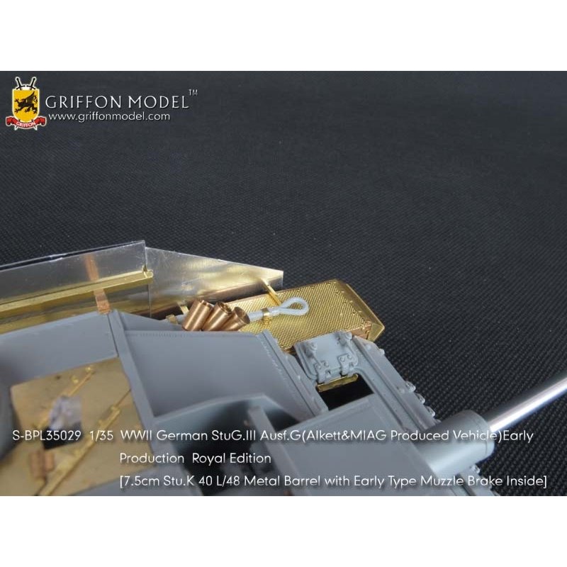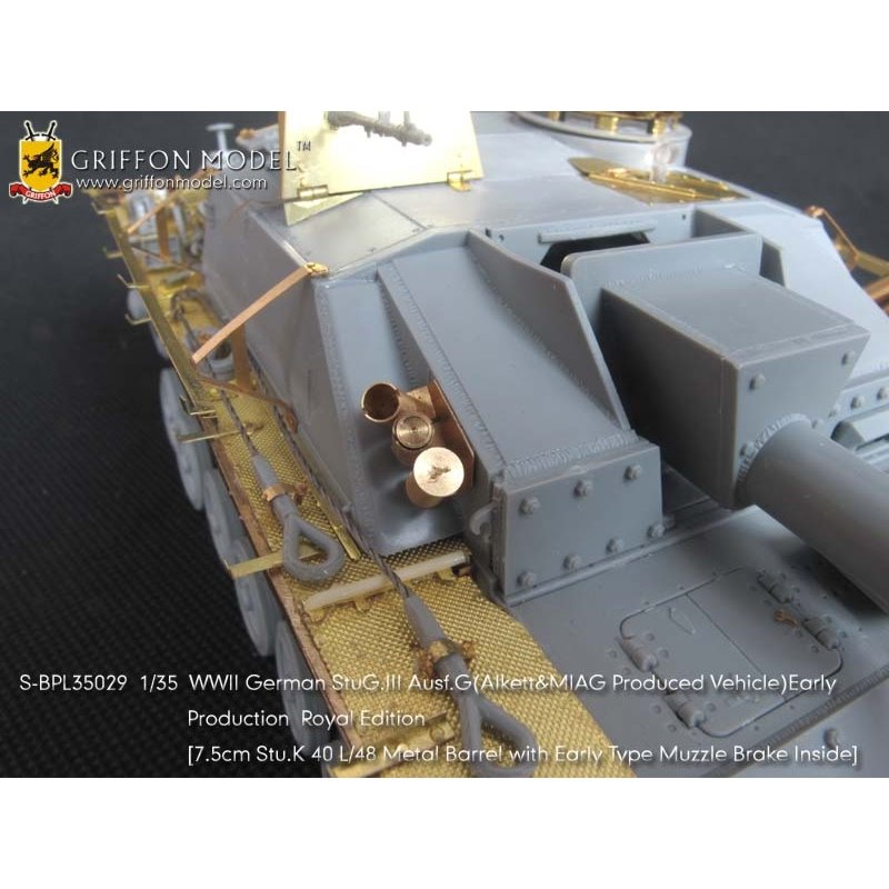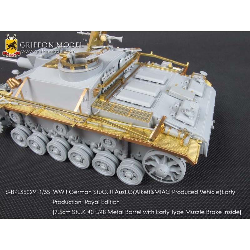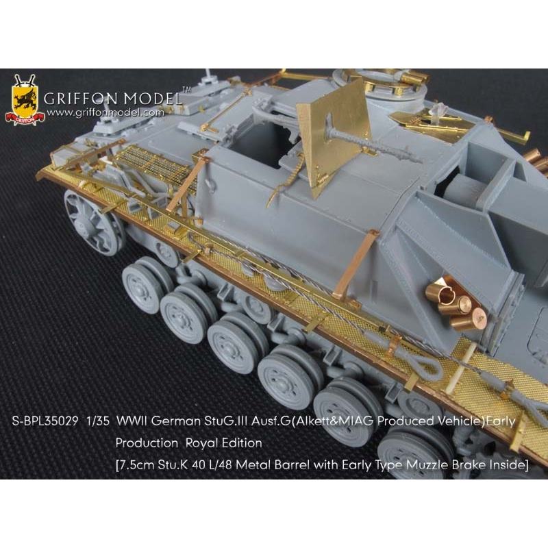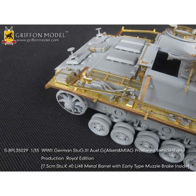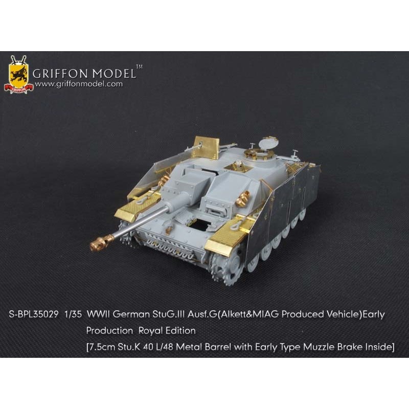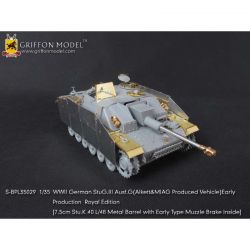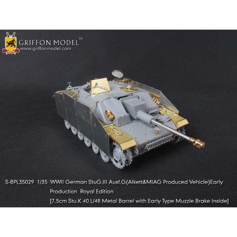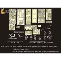 第二次大戦でドイツ軍が開発したIII号突撃砲G型初期生産型を再現したサイバーホビーのキットをシャープに仕上げます。セットはフェンダーパーツをはじめ、サイドアーマースカートのブラケットパーツ、ハッチ類のインテリアパーツなどまで各種パーツにくわえて金属製の砲身パーツ、マズルブレーキパーツなどもセットされた内容充実のセットです。エッチングパーツは表面のディテールもリアルなフェンダーパーツをはじめ、その取り付けステー、さらに、エンジンデッキのクーリングエアインテイクカバーメッシュ、装填手機関銃シールドや各ハッチのディテールパーツなどもセットされています。また、主砲砲身は金属パーツをセット。同じく金属製のマズルブレーキは初期型の形状をしっかりと再現。くわえて車体に装備されるスモークディスチャージャーに発煙弾、Nb.K.S.39スモークグレネードも金属パーツで用意。セットには詳しい説明書もついて、確実なディテールアップをお楽しみいただけます。プラスチックパーツとは違ったシャープなディテールがリアリティあふれる1ランク上の完成品を仕上げていただけるセットです。ベテランモデラーにはぜひ、利用していただきたいセットです。