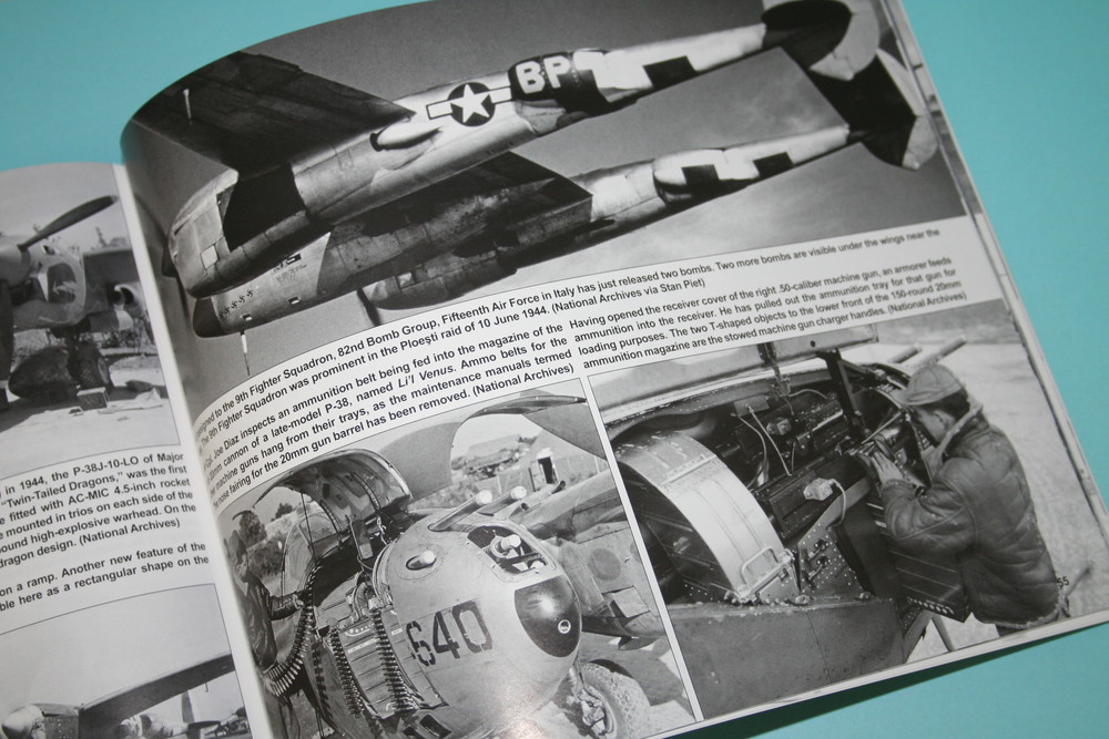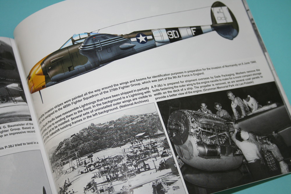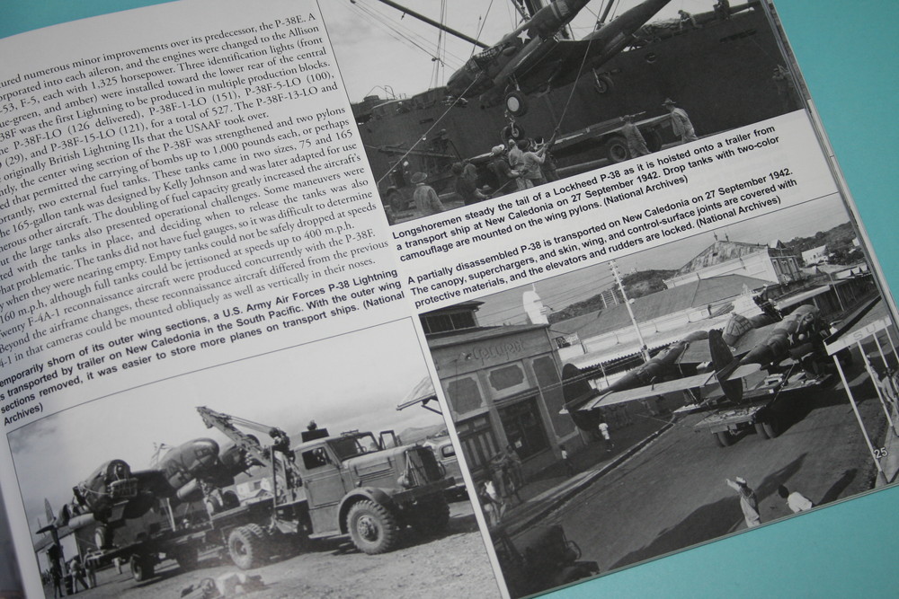 本書では当時の貴重な記録写真を多数収録するほか、細部を解説する線画も掲載し、タイプごとの違いもわかりやすく解説します。写真はモノクロだけでなくカラー写真も含まれ、当時の様子がより鮮明に伝わってきます。紹介しているのはXP-38、YP-38、P-38、RP-38、P-38D、P-38E、P-38F、P-38G、F-5A、P-38H、P-38J、F-5B、P-38L、P-38Mの各タイプです。写真は飛行状態の空撮から地上での整備風景や工場での生産ラインの風景、コクピットの内部など、多岐に渡り、ライトニングの全容を紹介します。模型制作の資料に、情景製作のイメージ作りに、見逃せない1冊です。
