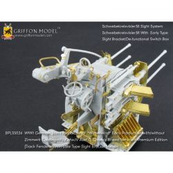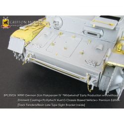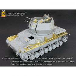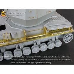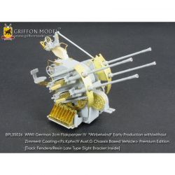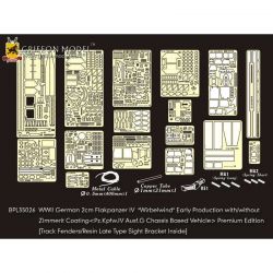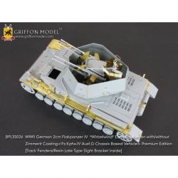 第二次大戦でアメリカ軍パイロットから恐れられたドイツ軍の2cmFlak38対空機関砲4連装をIV号戦車の車体に搭載した対空戦車ヴィルベルヴィントの初期型を再現したサイバーホビーのキット(No.6565/6342)をシャープに仕上げます。セットのエッチングパーツは車体の左右フェンダーパーツをはじめとする外装パーツのほか、もちろん、独特な形状のオープントップ砲塔の内部やFlak38のディテールアップパーツなどを収録。フェンダー表面には滑り止めのディテールもしっかりと表現。また、Flak38の2cm機関砲の防盾パーツをはじめ、射撃主のフットペダルやシートサポートアームなどのディテールパーツや砲塔内側に装着されるマガジンラックなどもセットしています。セットには詳しい説明書もついて、確実なディテールアップをお楽しみいただけます。プラスチックパーツとは違ったシャープなディテールがリアリティあふれる1ランク上の完成品を仕上げていただけるセットです。ベテランモデラーにはぜひ、利用していただきたいセットです。