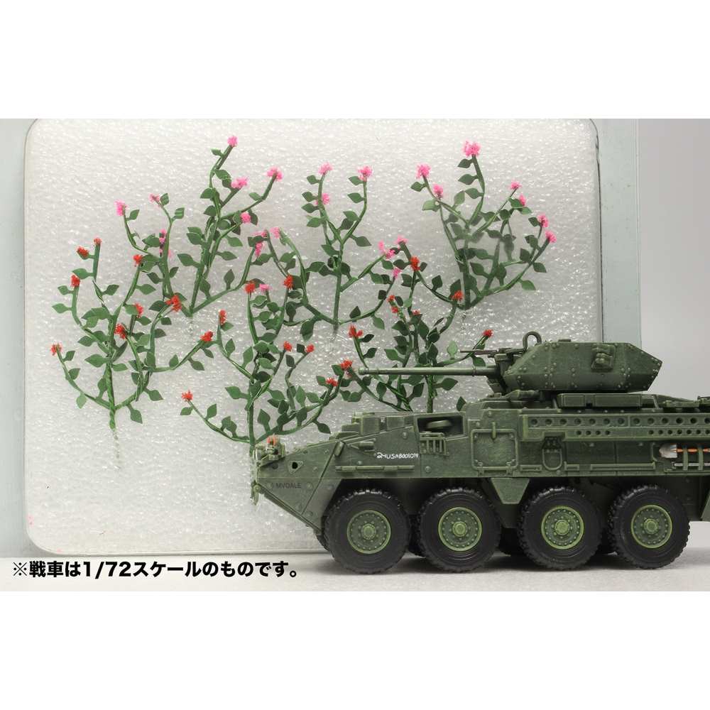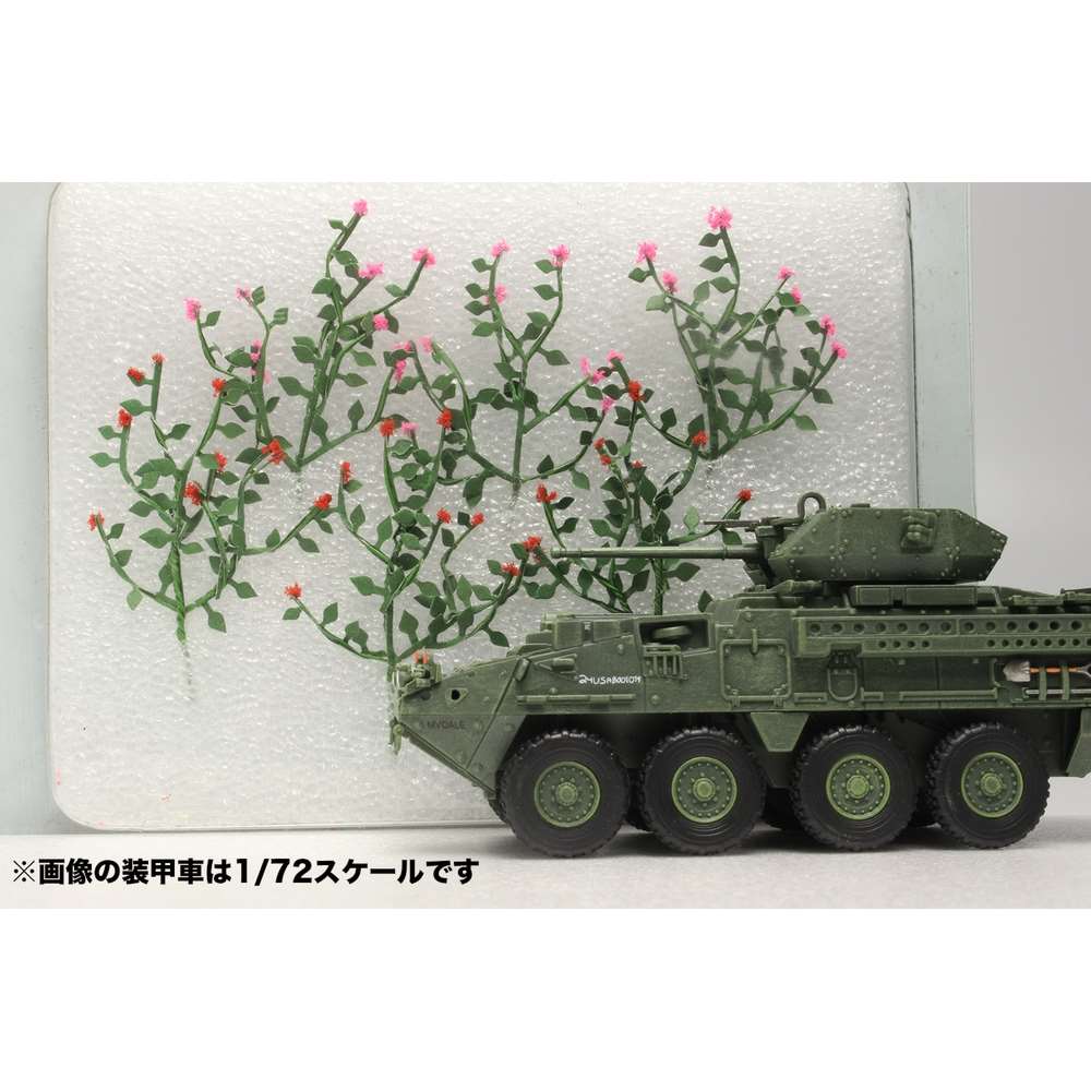 自然な枝の張り方や花の付き方が情景でも雰囲気を高めます。枝は6本セット。そのうち3本がピンクのバラ、残りの3本が赤いバラを再現しています。それぞれの枝は付け根の部分から先端まで約32mm。一つの枝パーツに7輪ほどのバラが咲いた状態でモデル化しています。1本1本使ってみるのも、組み合わせて使ってみるのもアイデアが広がります。