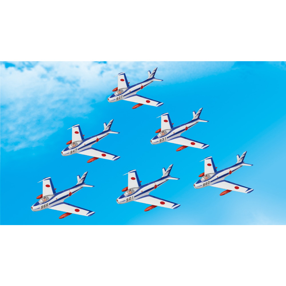 1964年当時のチームの機体は、全面白地に明るいブルーの帯が入るスタイル。各地の 基地祭で活躍し、チーム最終期の1980年と81年には6機編成でのショーも披露した、 初代ブルーインパルスの勇姿が机上によみがえるセットです。