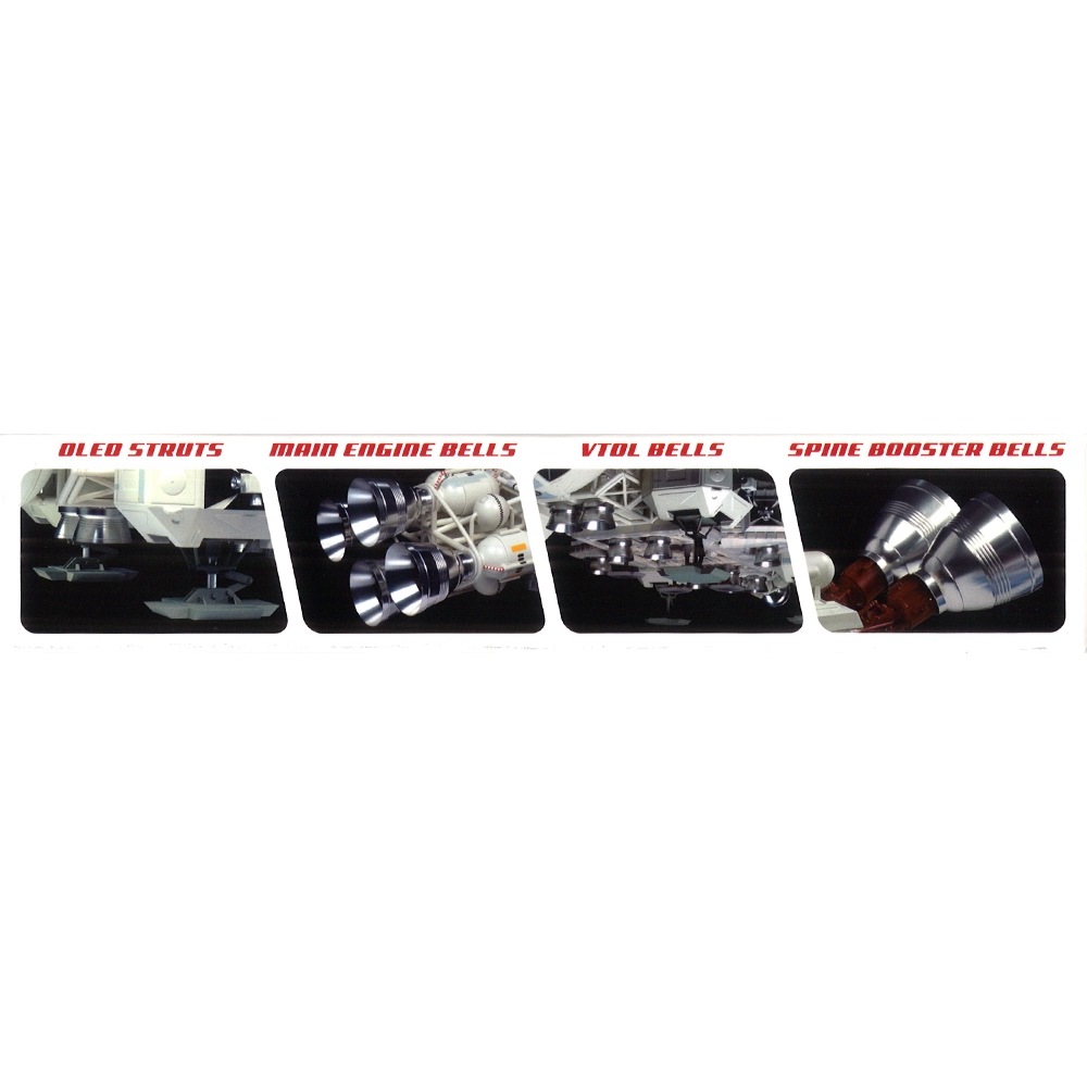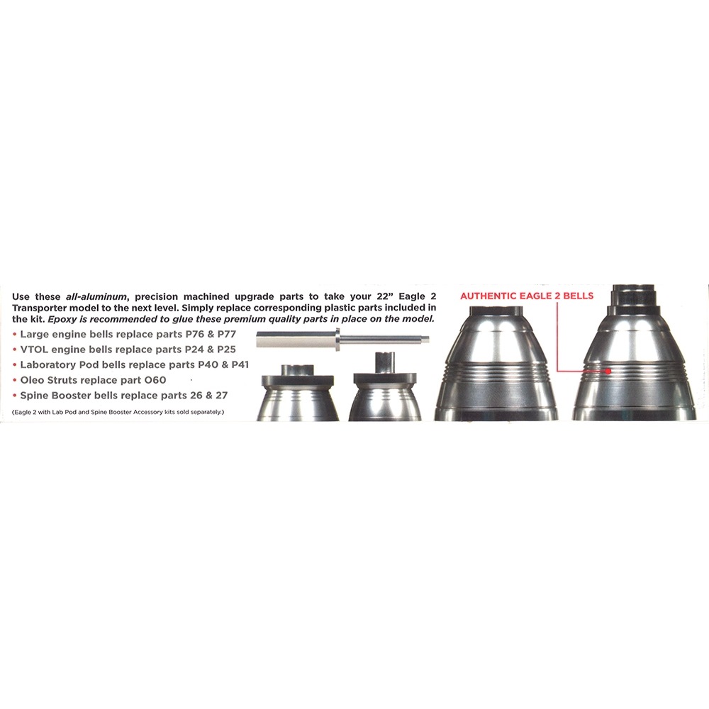 MPCから発売される1/48スケールのイーグル2・トランスポーター w/ラボポッド(MPC923)に対応するディテールアップパーツのセットです。 機体後部に取り付けられている4基のメインエンジンノズルパーツをはじめ、VTOLエンジンノズル、ラボラトリーポッドのノズルを、アルミ製 パーツで置き換え、金属ならでのは質感とシャープさでモデルの仕上がりをよりいっそう高めます。 また、ランディングギアのストラット部品もアルミパーツで用意。MPCの1/48モデルでは金属スプリングを内蔵して可動する部分だけに、金属製 の支柱パーツは可動時の強度を高め、完成後のディスプレイでも安心感がアップします。 さらに、オプションキットのブースターパック(MKA043)用のアルミ製ノズルパーツも2基セット。ラボポッドに加えブースターパックを装備し たフル装備状態もまとめてディテールアップが可能です。 1/48スケールのMPCイーグル2・トランスポーター(MPC923)キット、及びそのオプションキットであるブースターパック(MKA043)の組み 立て時に、ぜひ一緒に揃えてリアルな仕上がりを楽しんで下さい。