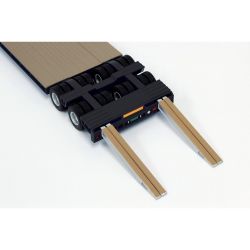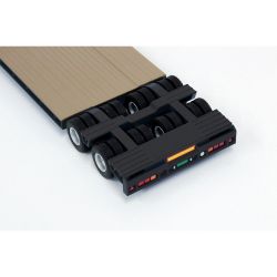 また、タイヤ部分はタンデムアクスル専用のトラニオン式サスペンションの独特なメカニズムをリアルに表現し、実車同様に可動が楽しめます。さらに、後部に装備して搭載車両を載せたりおろしたりする際に使用する道板4枚も用意。取り付け、取り外しも可能です。全長は約250mm、幅 約65mm。ダイキャスト製で重量は約340g。重量感も魅力です。