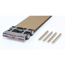 また、タイヤ部分はタンデムアクスル専用のトラニオン式サスペンションの独特なメカニズムをリアルに表現し、実車同様に可動が楽しめます。さらに、後部に装備して搭載車両を載せたりおろしたりする際に使用する道板4枚も用意。取り付け、取り外しも可能です。全長は約250mm、幅 約65mm。ダイキャスト製で重量は約340g。重量感も魅力です。